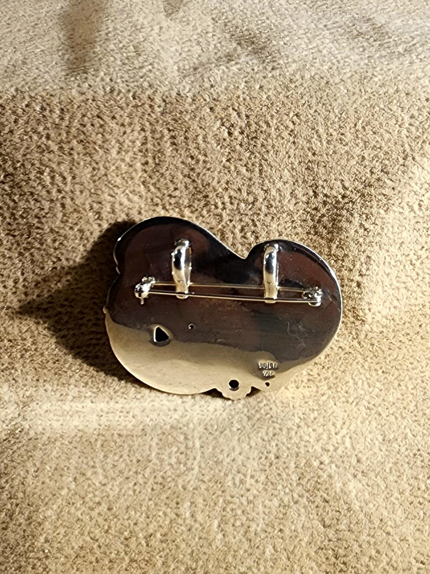 This unique piece can be worn as a brooch or as a necklace. The gemstones are peridot, amethyst, abalone, and iolite. The faces are made from carved buffalo bone and are set in sterling silver. Made in Bali.