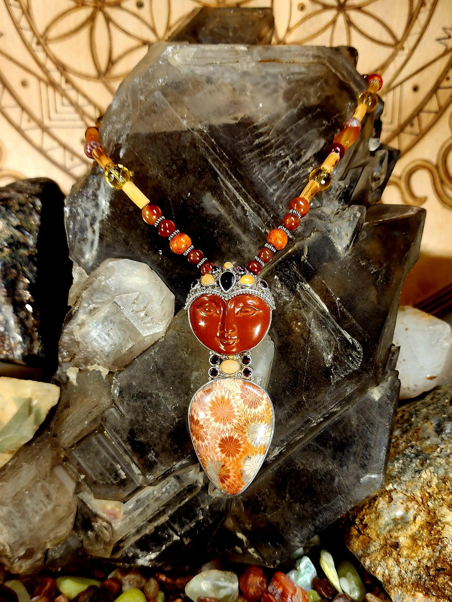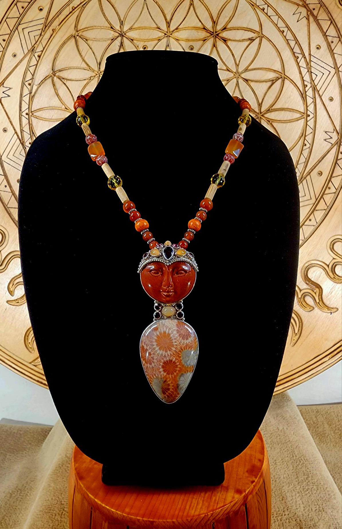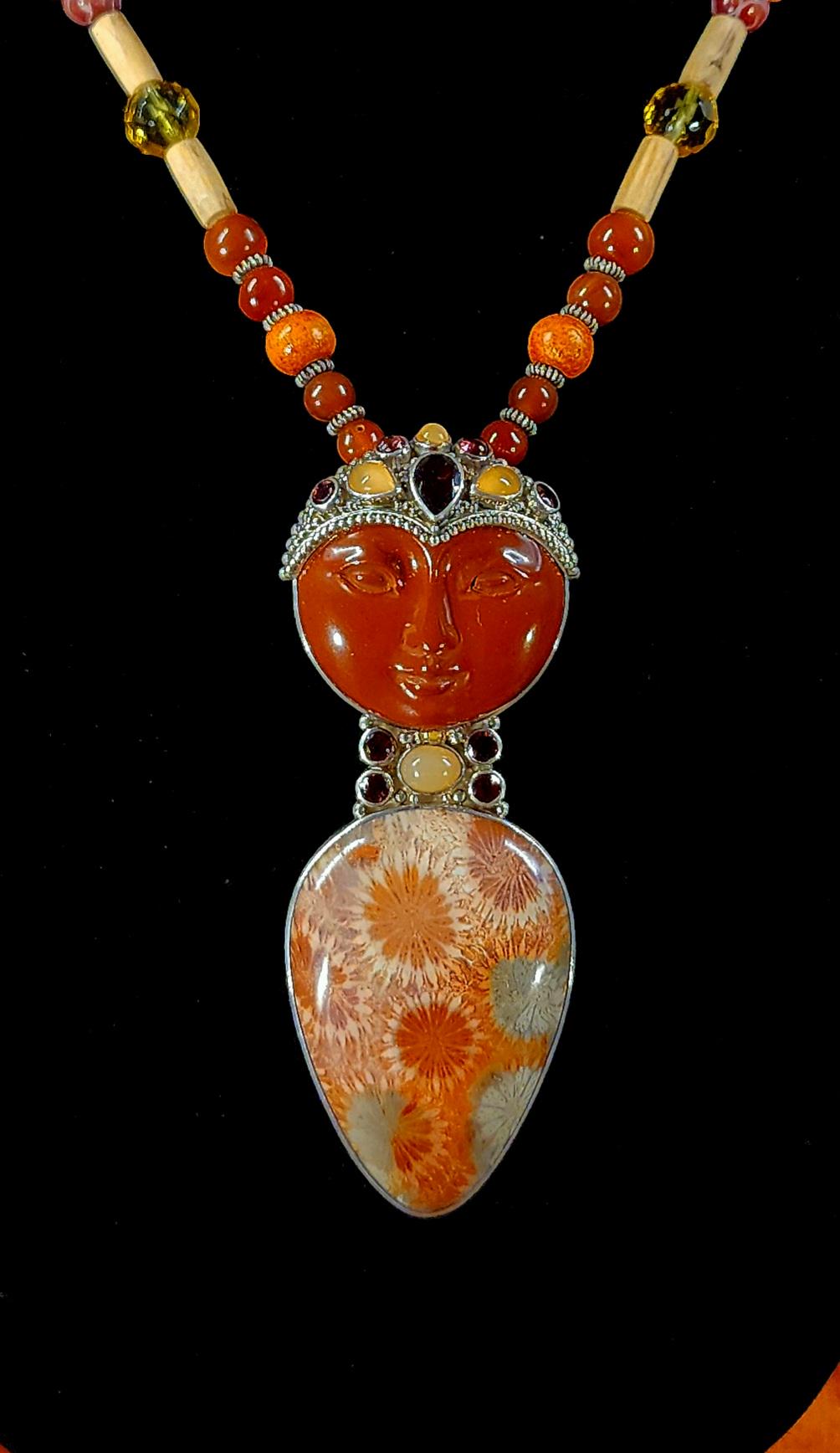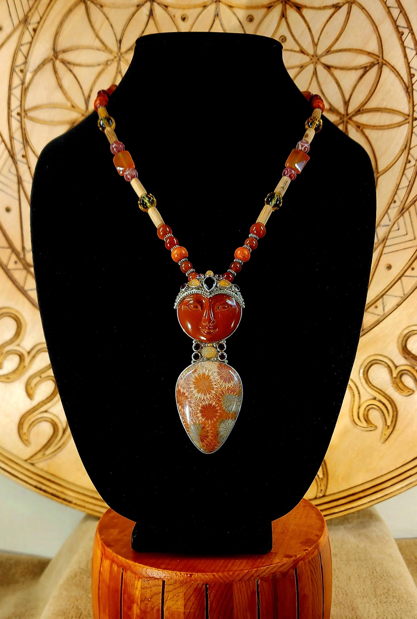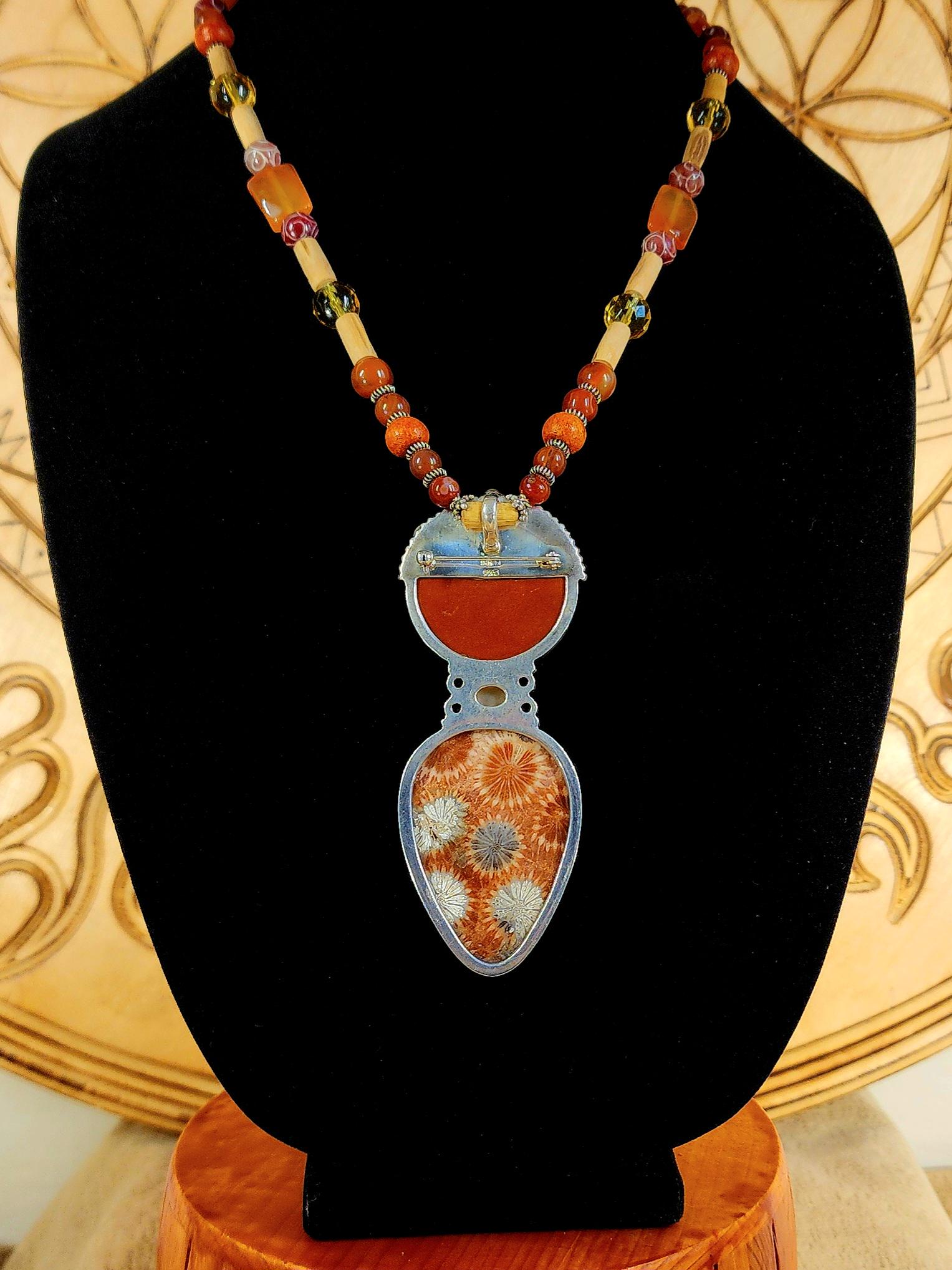 Sterling Silver Red Jasper Vintage Pendant with Hand Beaded Necklace. The Pendant Piece contains Red Jasper, Fossilized Coral Flower Agate, Garnet and Peach Moonstone. The hand beaded necklace is made of Carnelian, Citrine, Red Jade, and Tulsi Beads.