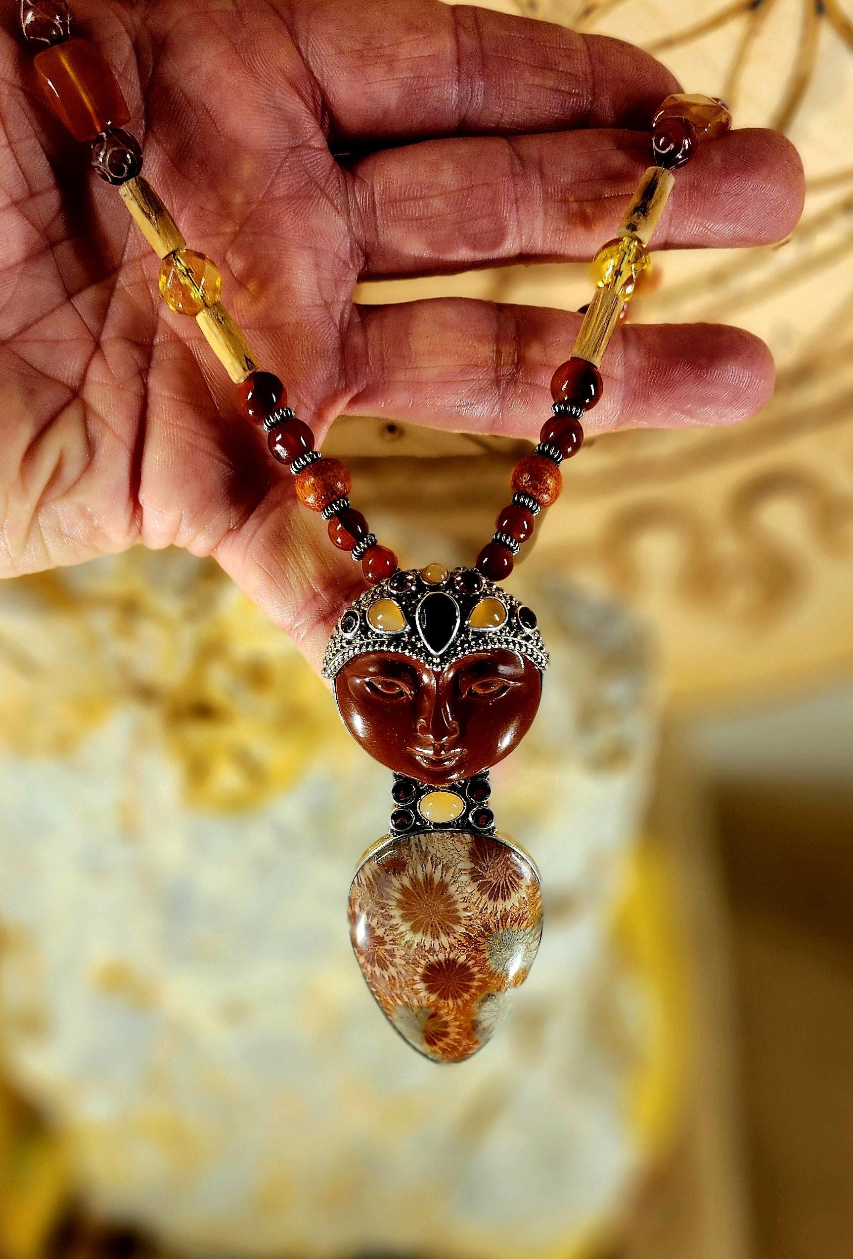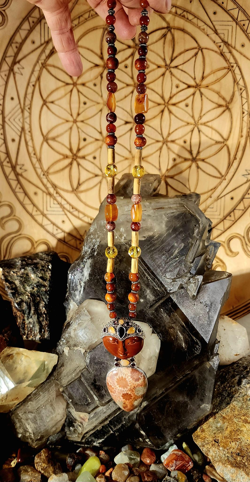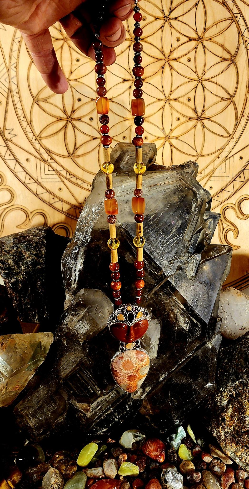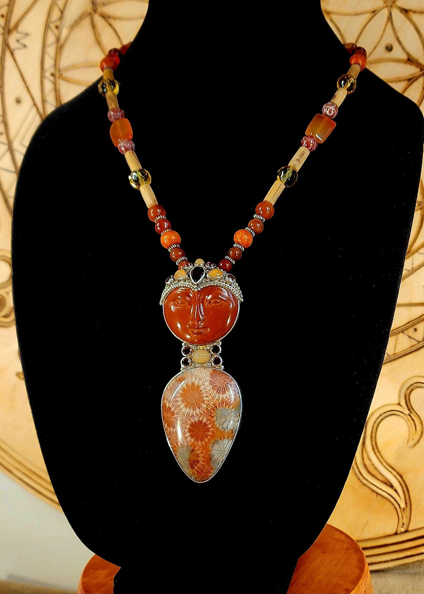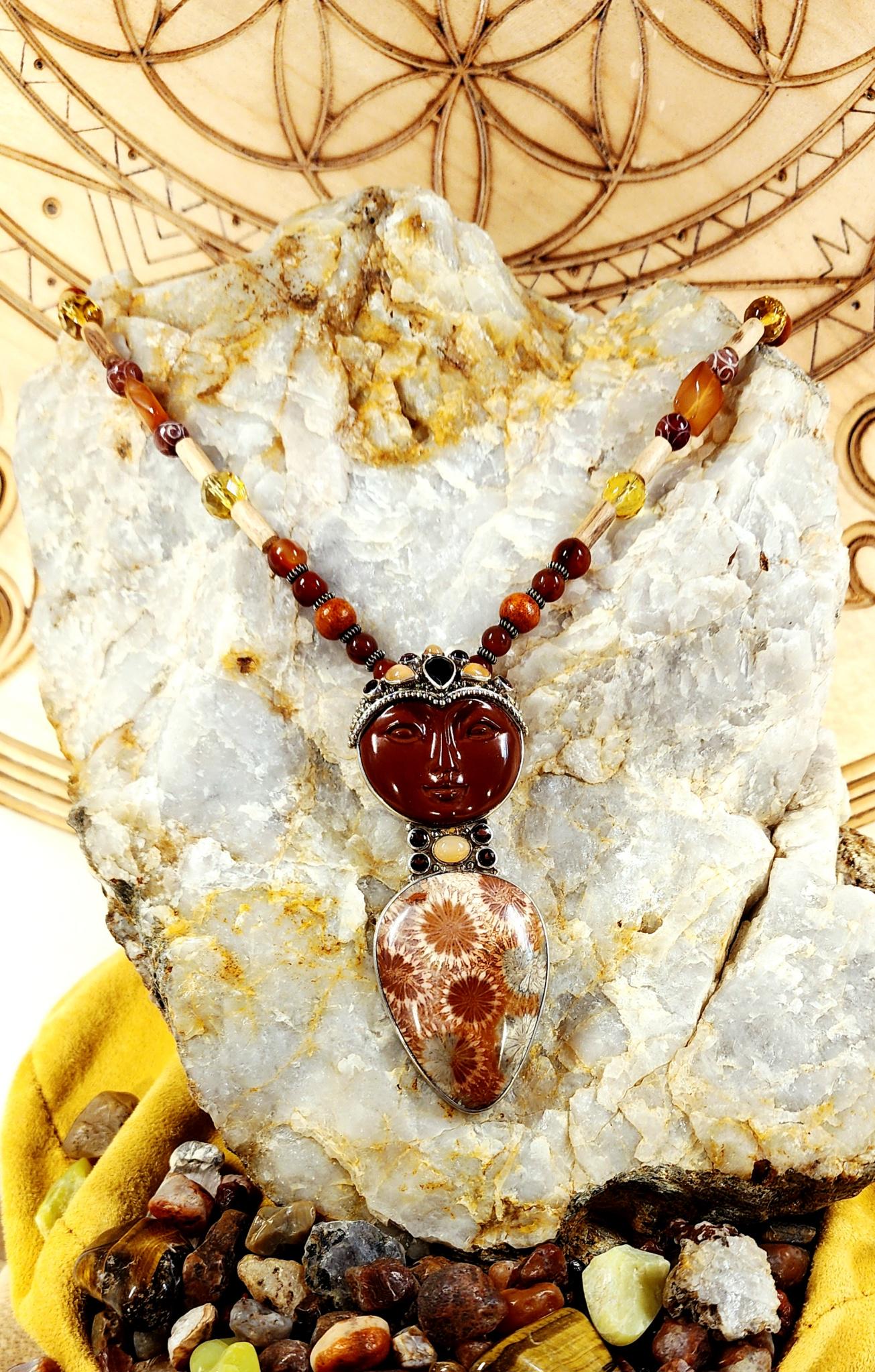 Sterling Silver Red Jasper Vintage Pendant with Hand Beaded Necklace. The Pendant Piece contains Red Jasper, Fossilized Coral Flower Agate, Garnet and Peach Moonstone. The hand beaded necklace is made of Carnelian, Citrine, Red Jade, and Tulsi Beads.