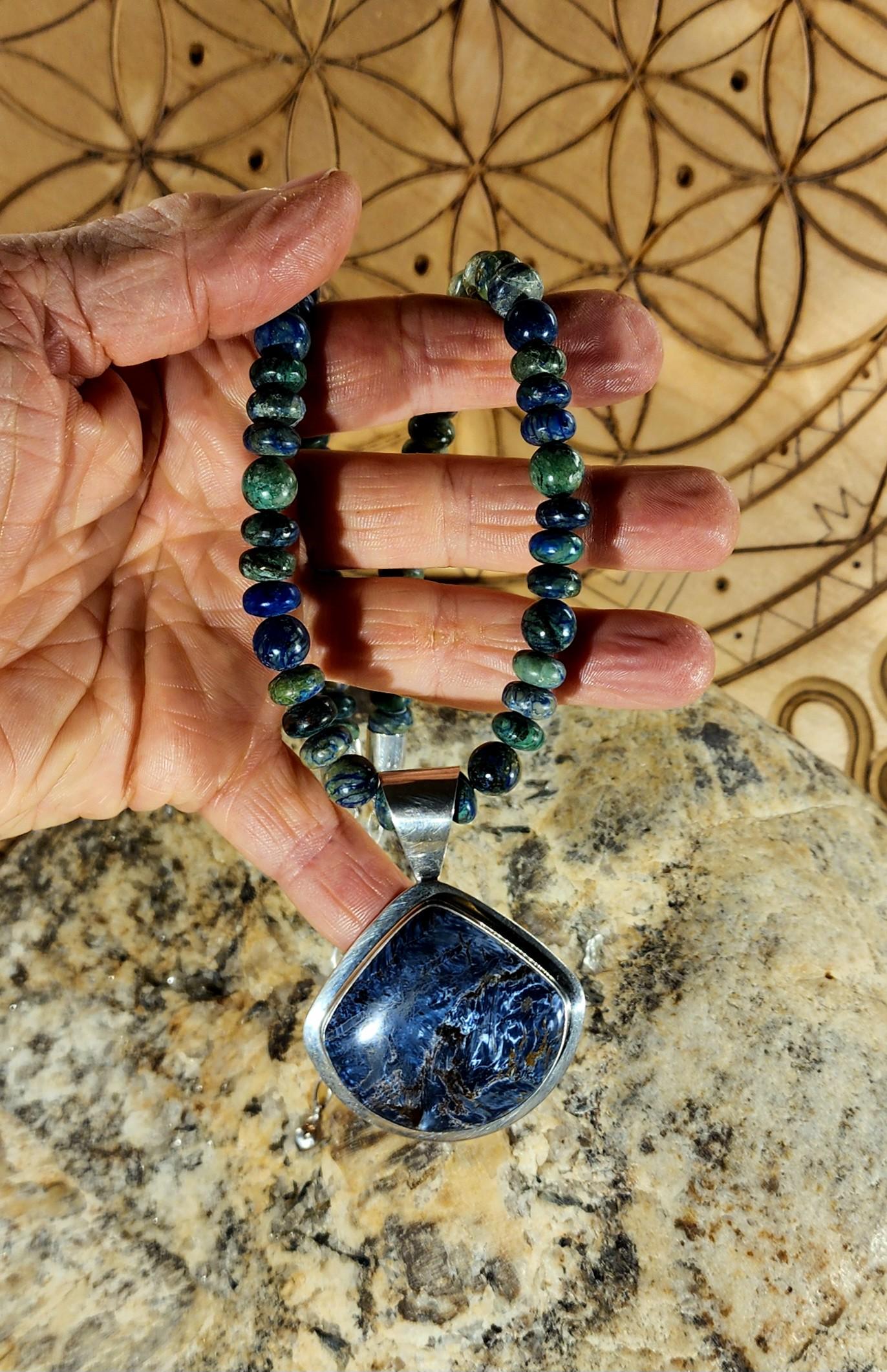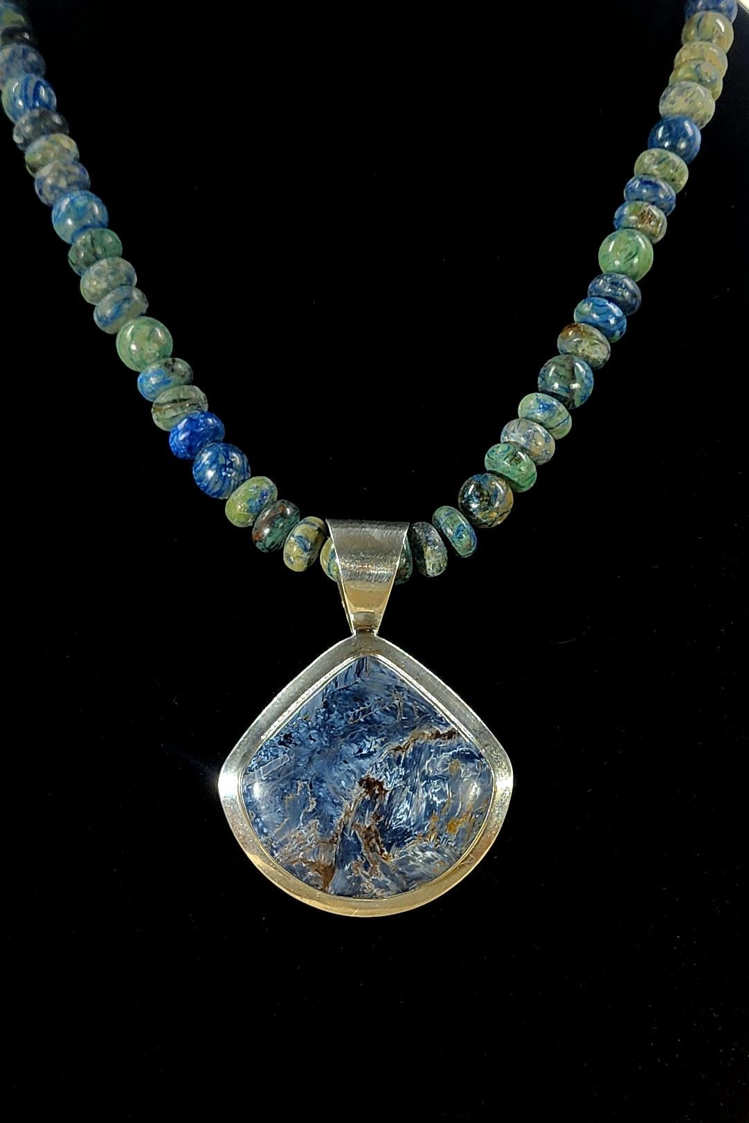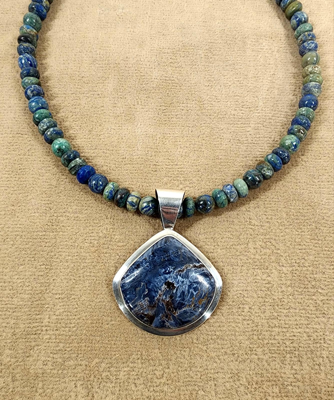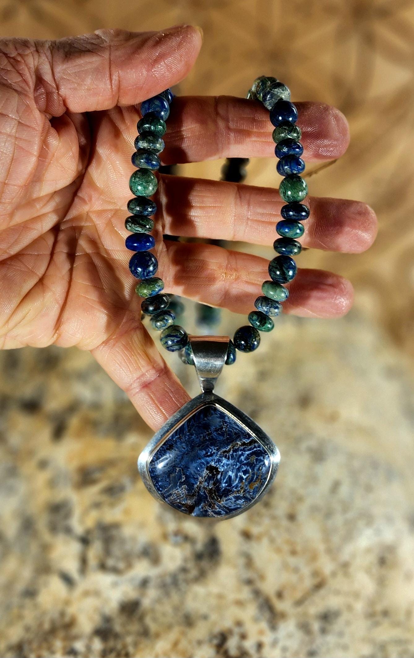 Beautiful Sterling Silver Pietersite Pendant from Namibia Africa. The necklace is made from high quality Azurite beads and has an adjustable Sterling Silver clasp.
