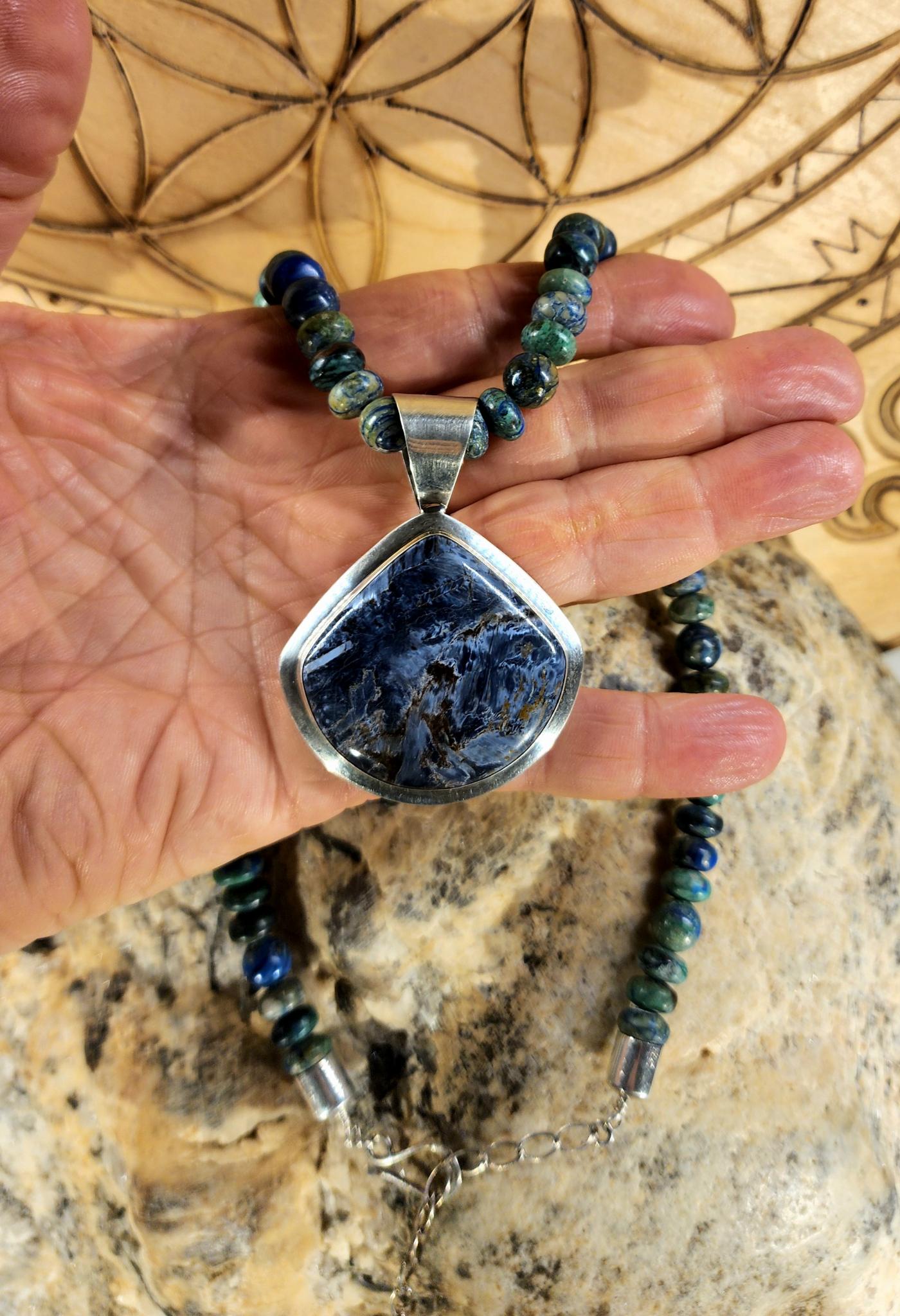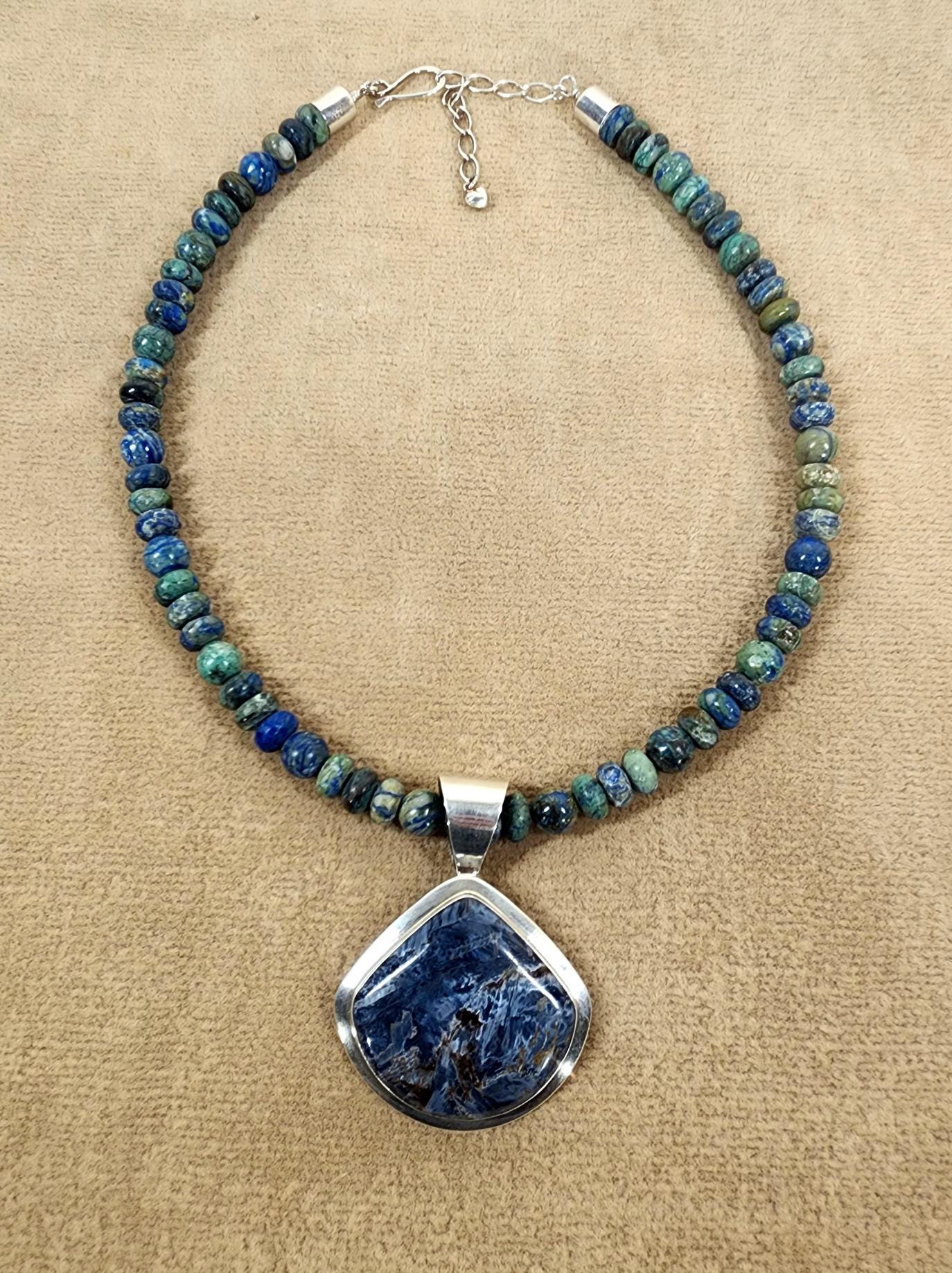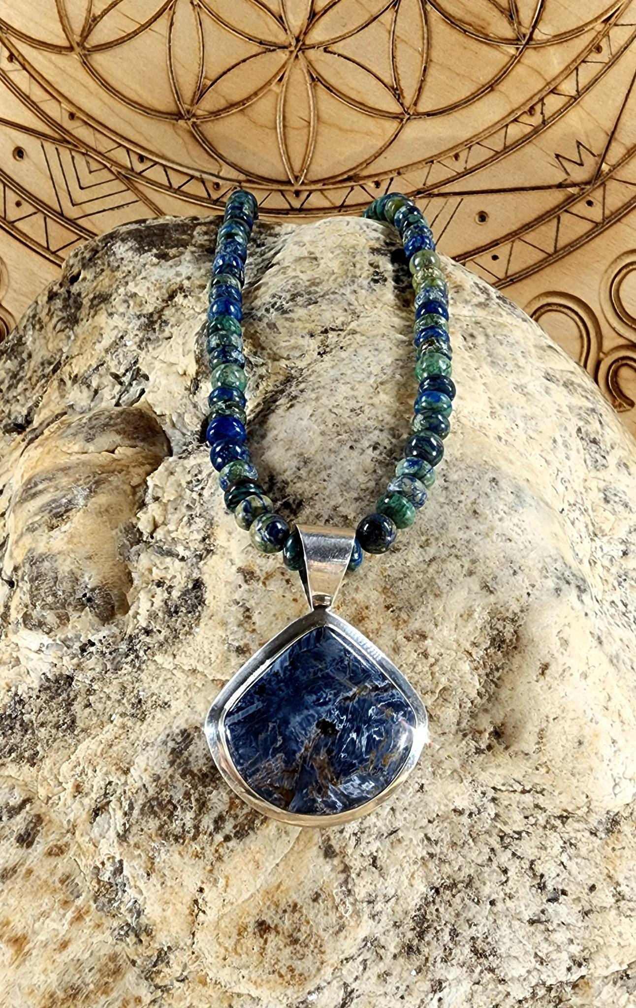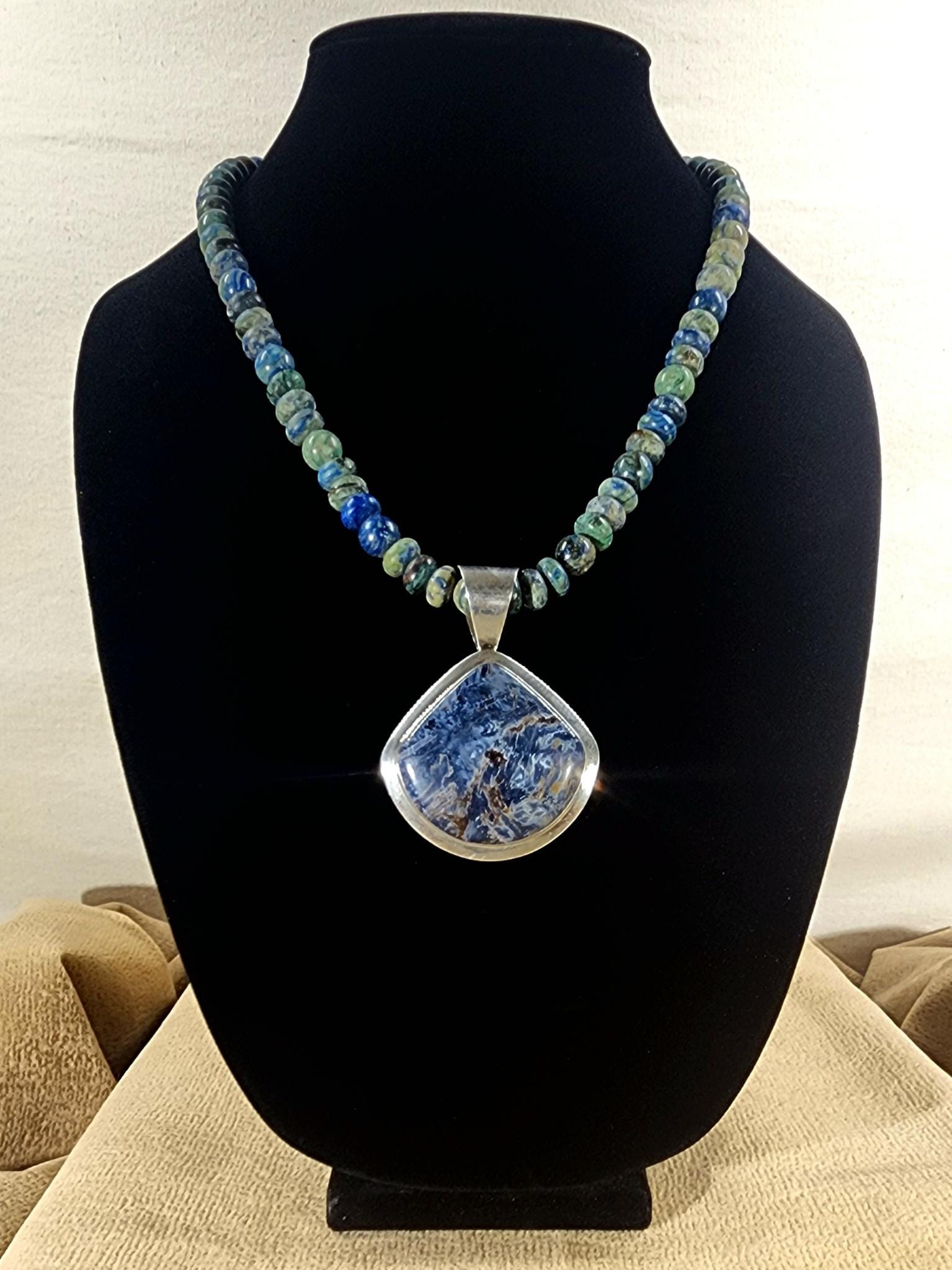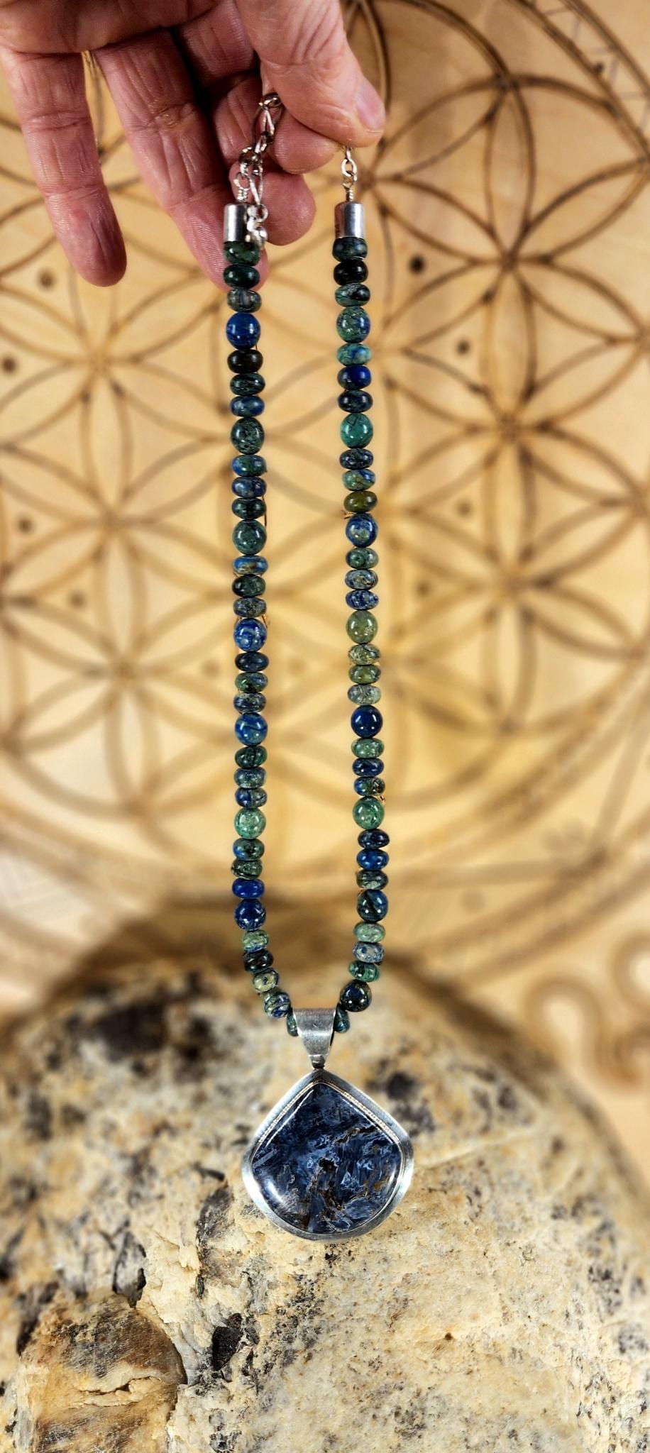 Beautiful Sterling Silver Pietersite Pendant from Namibia Africa. The necklace is made from high quality Azurite beads and has an adjustable Sterling Silver clasp.