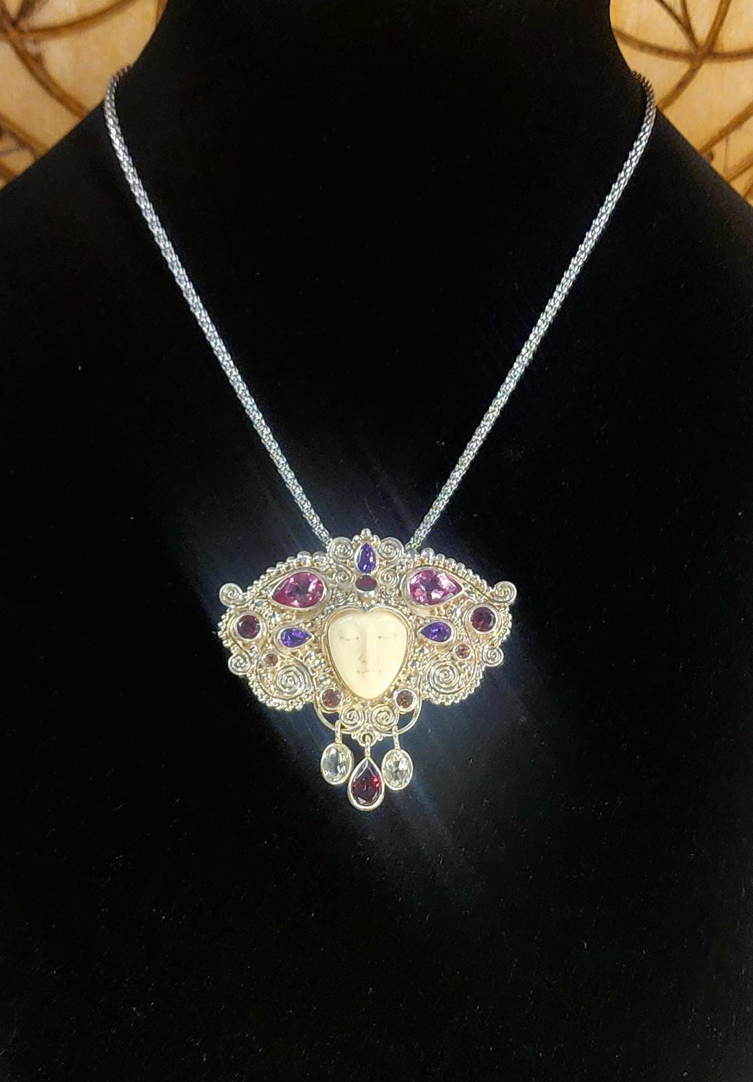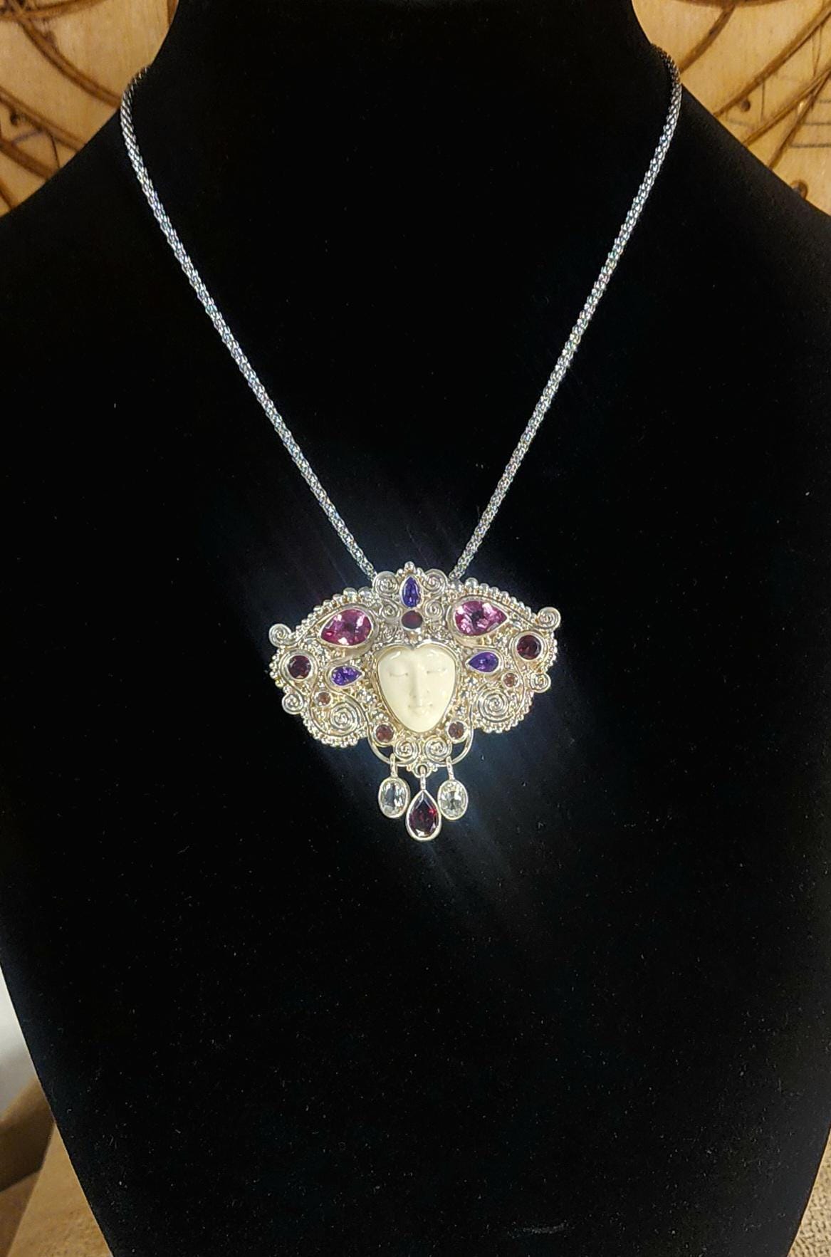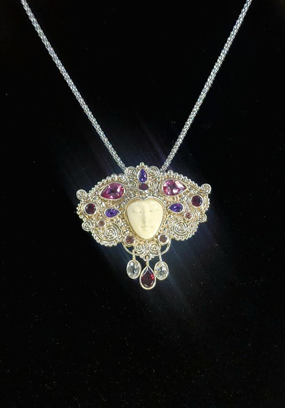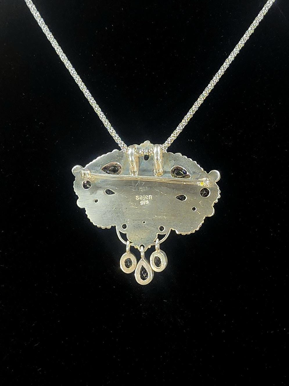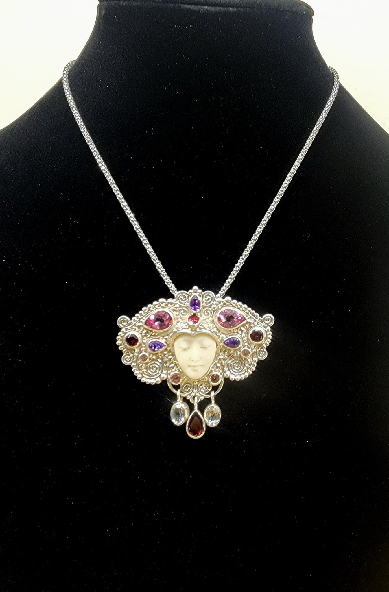 Such a Sweet Sterling Silver Vintage Pendant-Brooch Necklace piece. Made with gemstones of Pink Tourmaline, Ruby, Garnet, Amethyst and Iolite set in Sterling Silver with an 18" Italian Silver Chain.