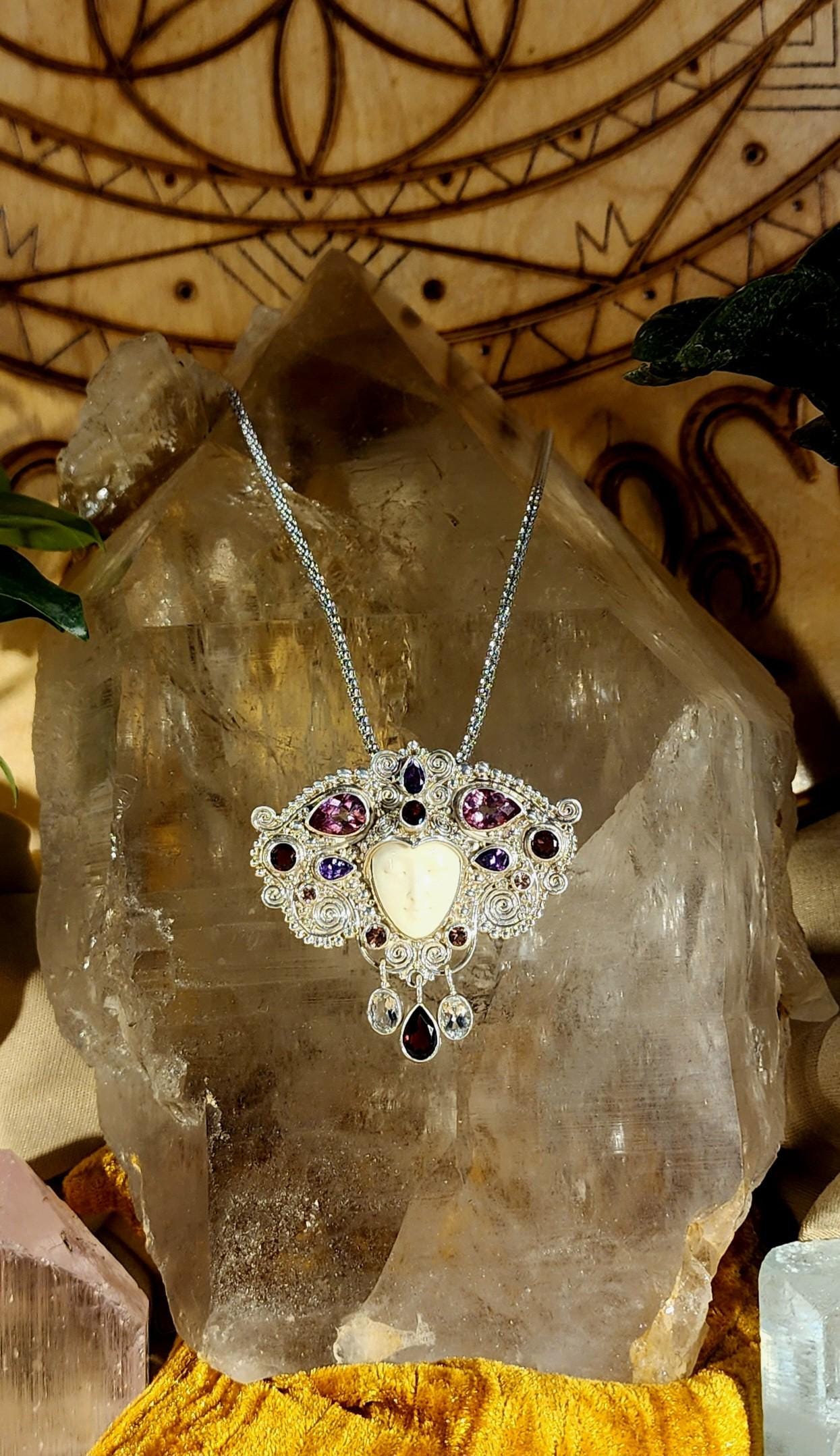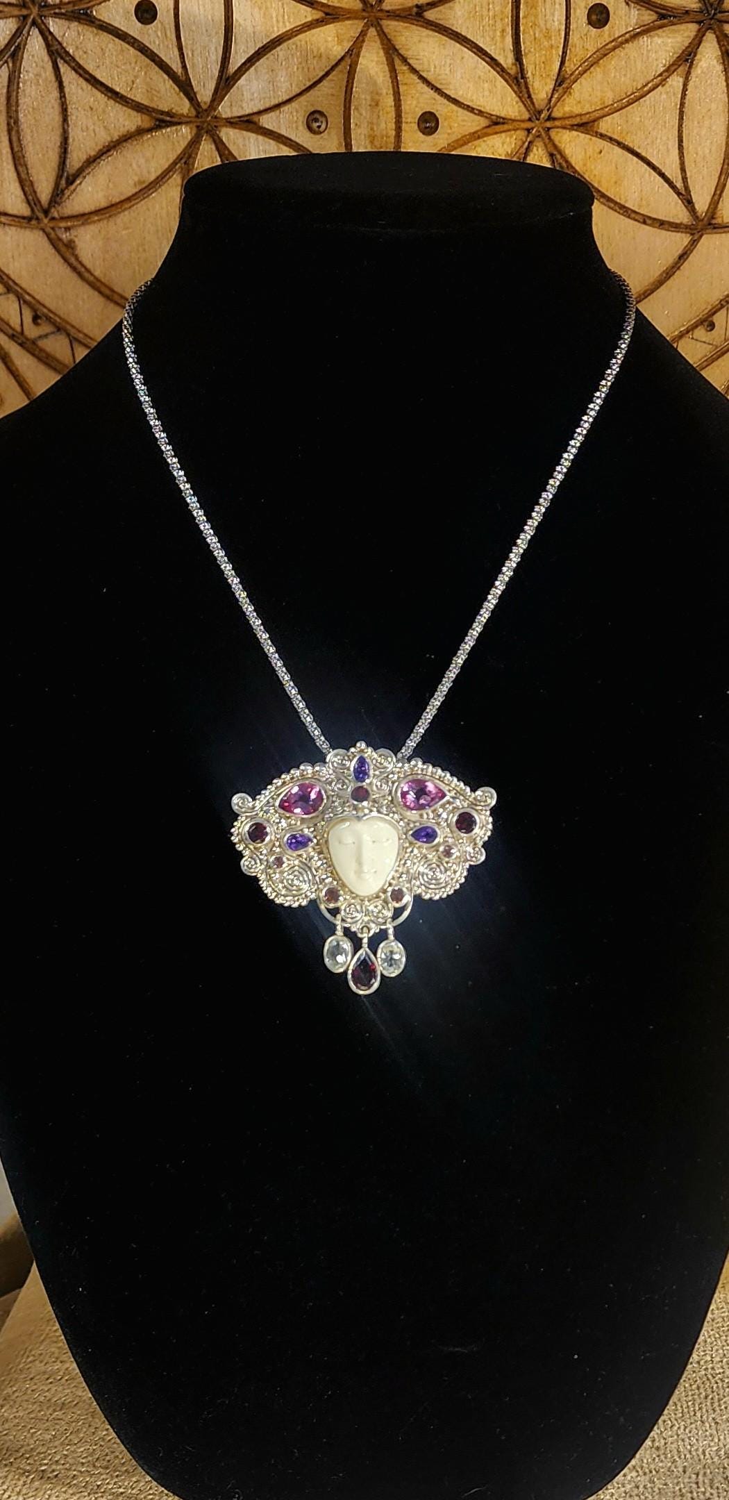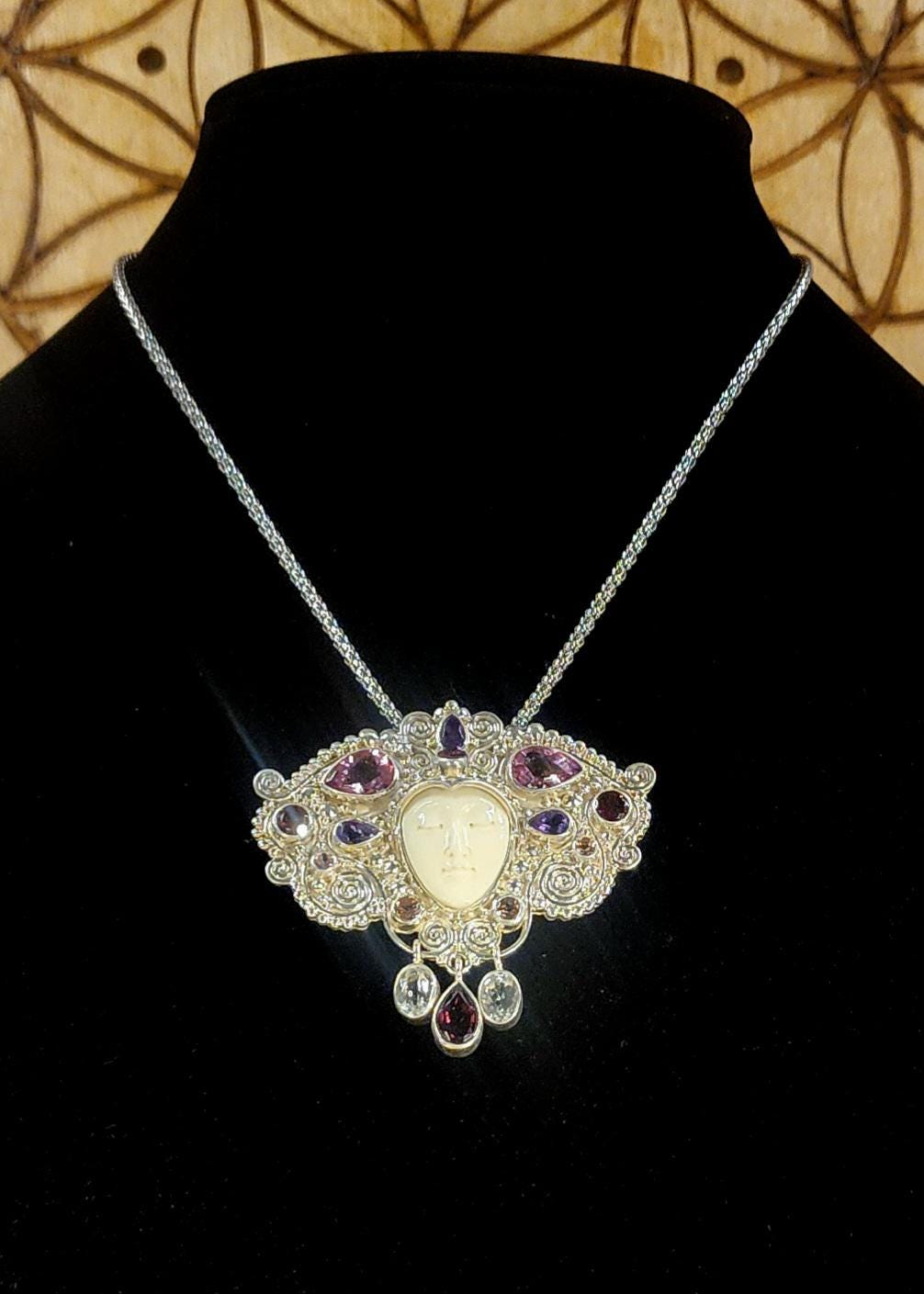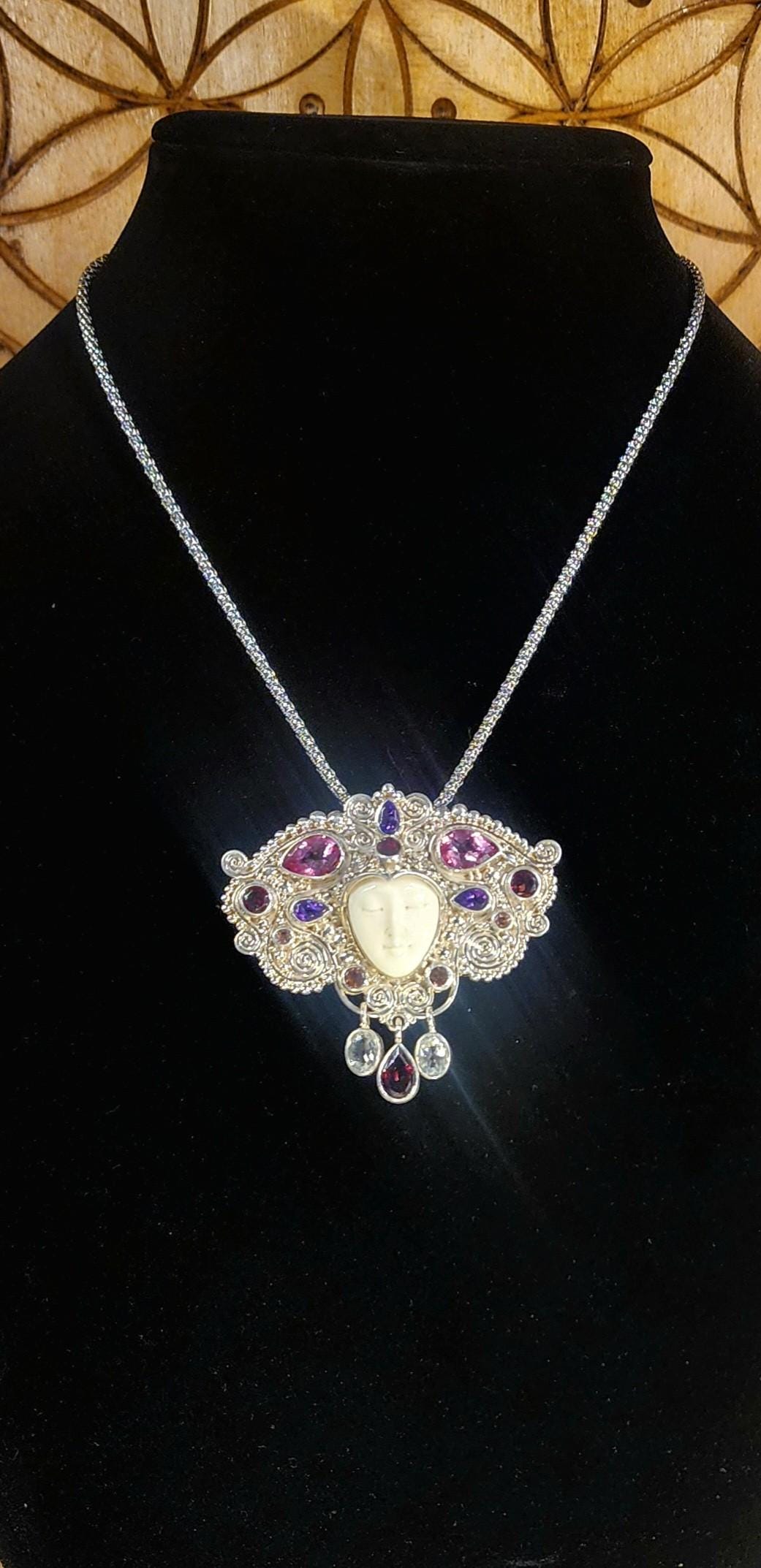 Such a Sweet Sterling Silver Vintage Pendant-Brooch Necklace piece. Made with gemstones of Pink Tourmaline, Ruby, Garnet, Amethyst and Iolite set in Sterling Silver with an 18" Italian Silver Chain.
