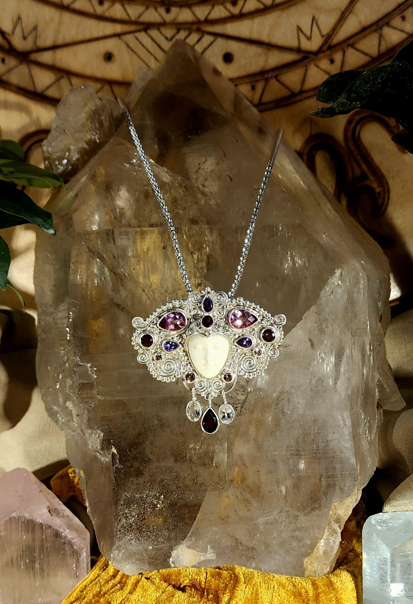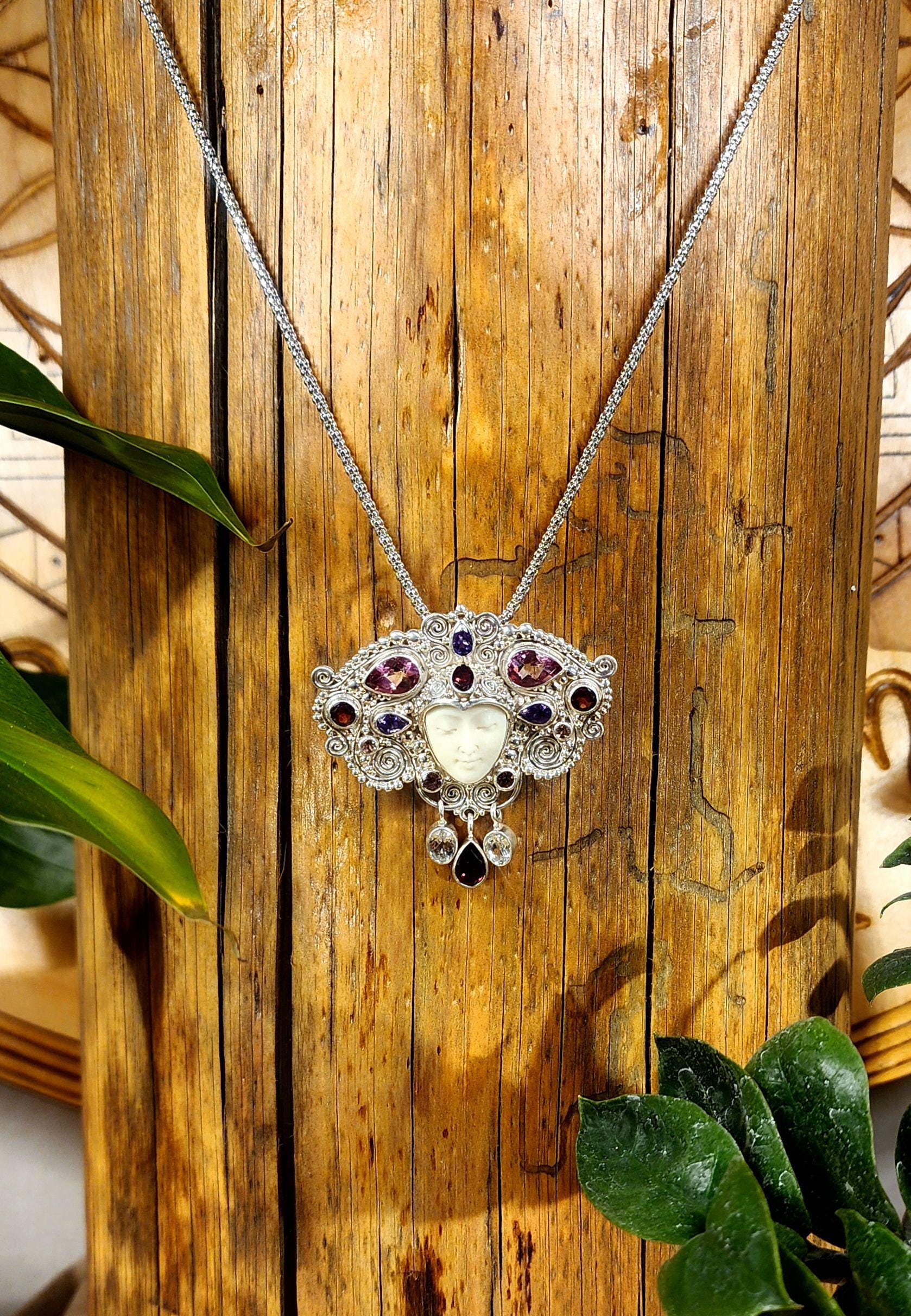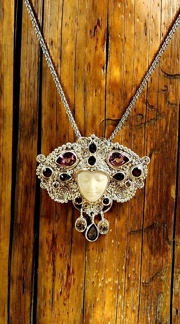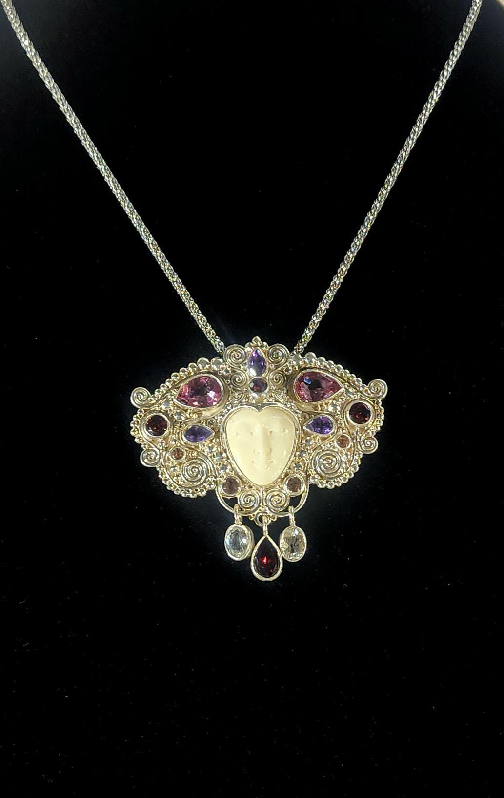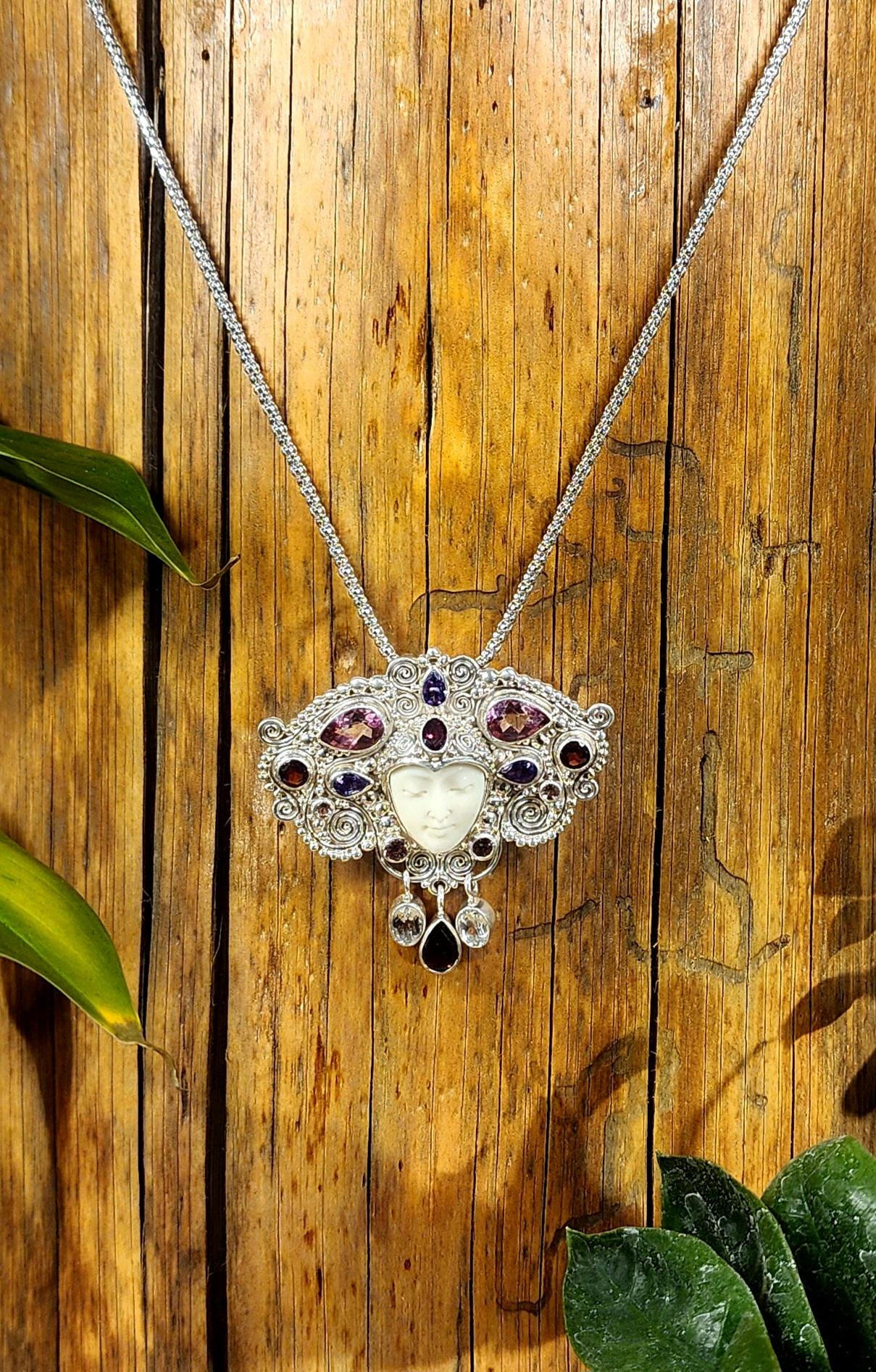 Such a Sweet Sterling Silver Vintage Pendant-Brooch Necklace piece. Made with gemstones of Pink Tourmaline, Ruby, Garnet, Amethyst and Iolite set in Sterling Silver with an 18" Italian Silver Chain.