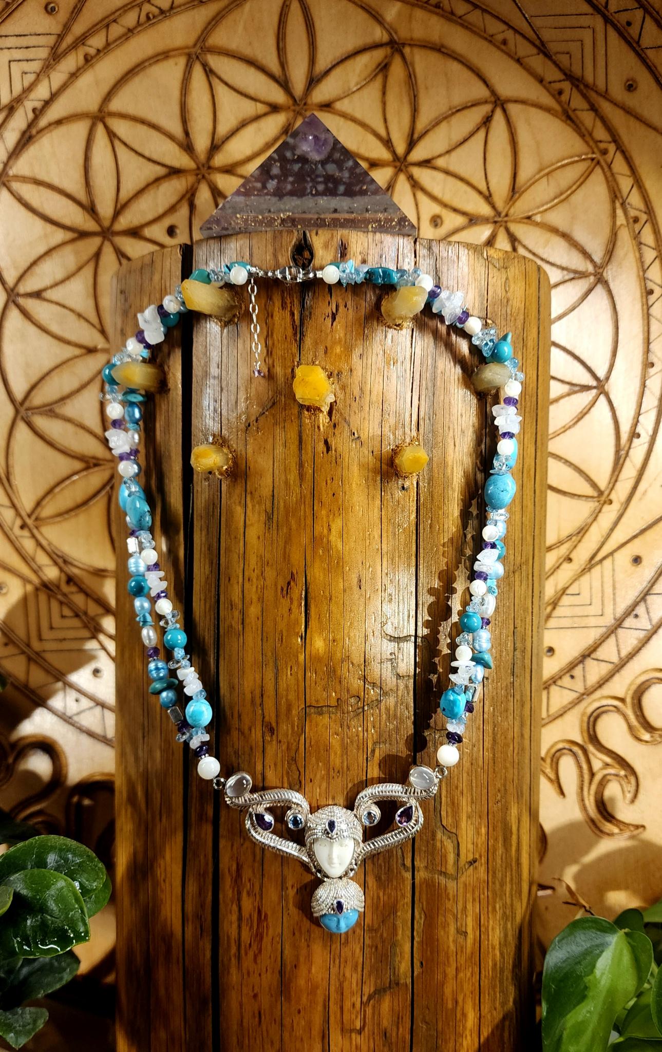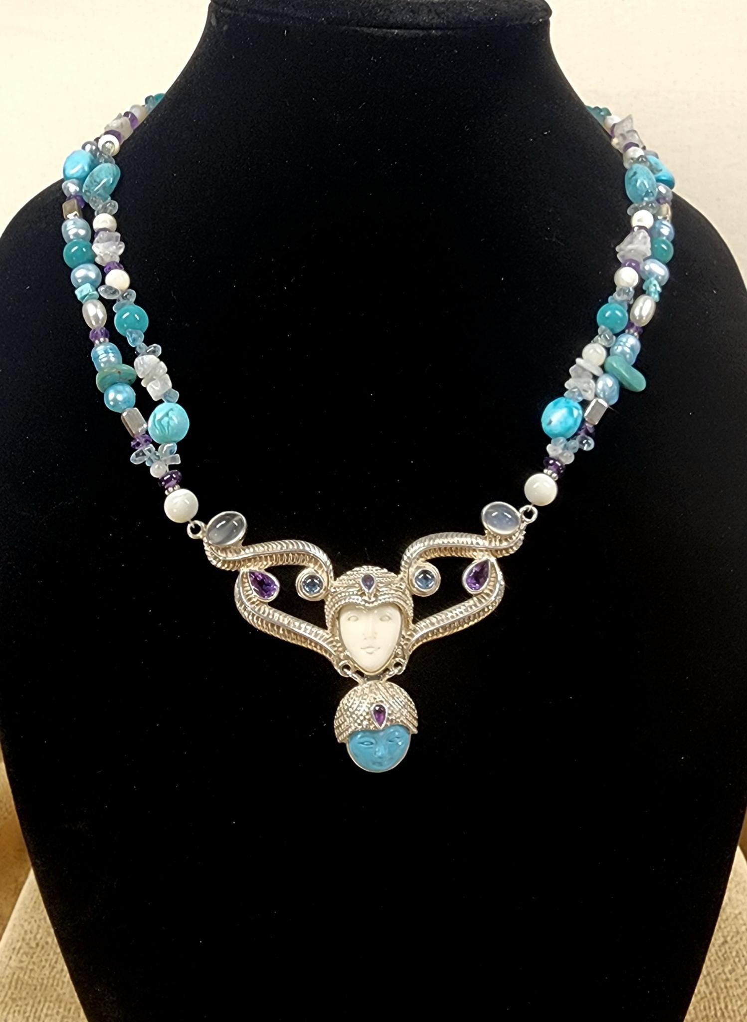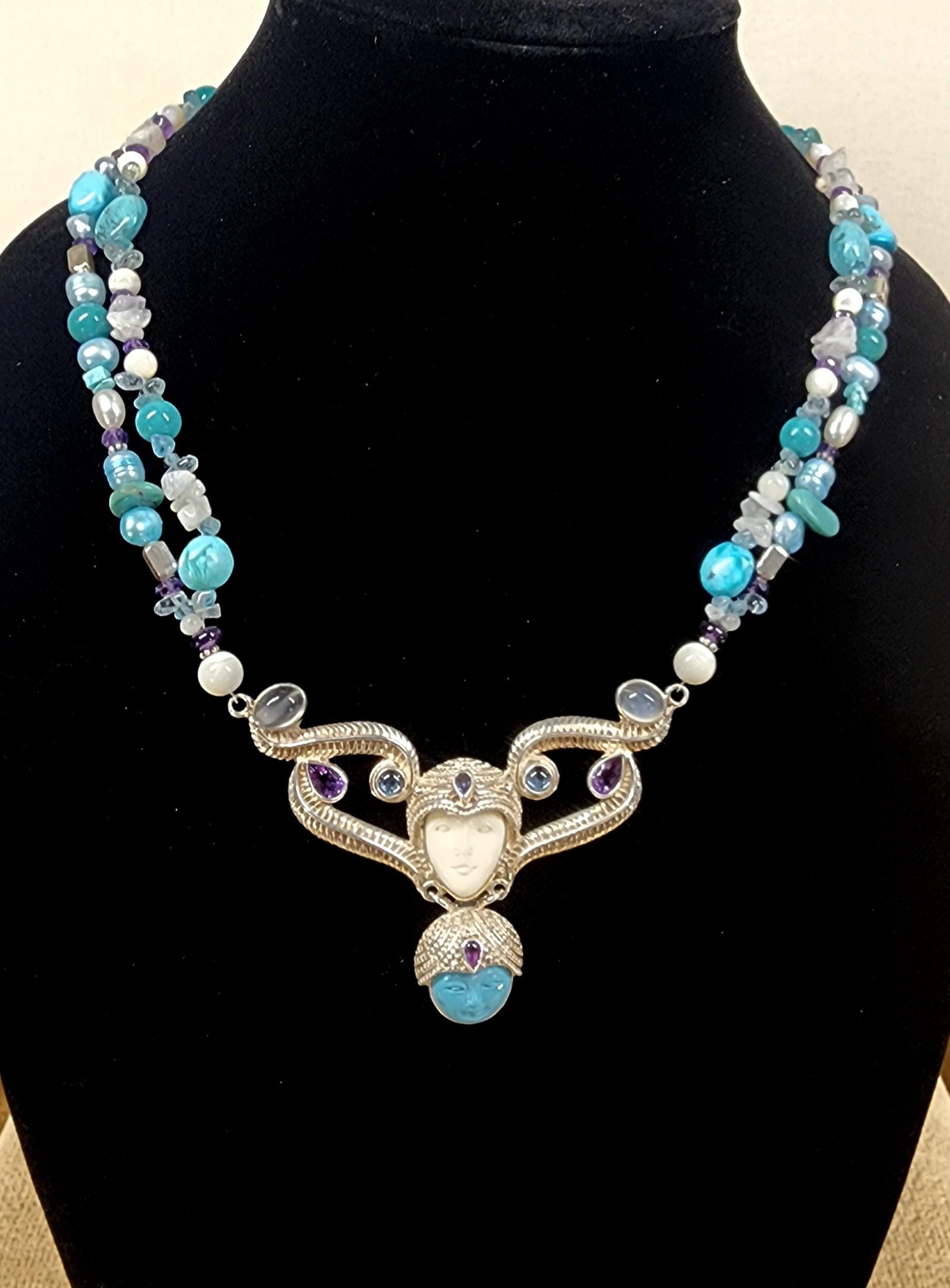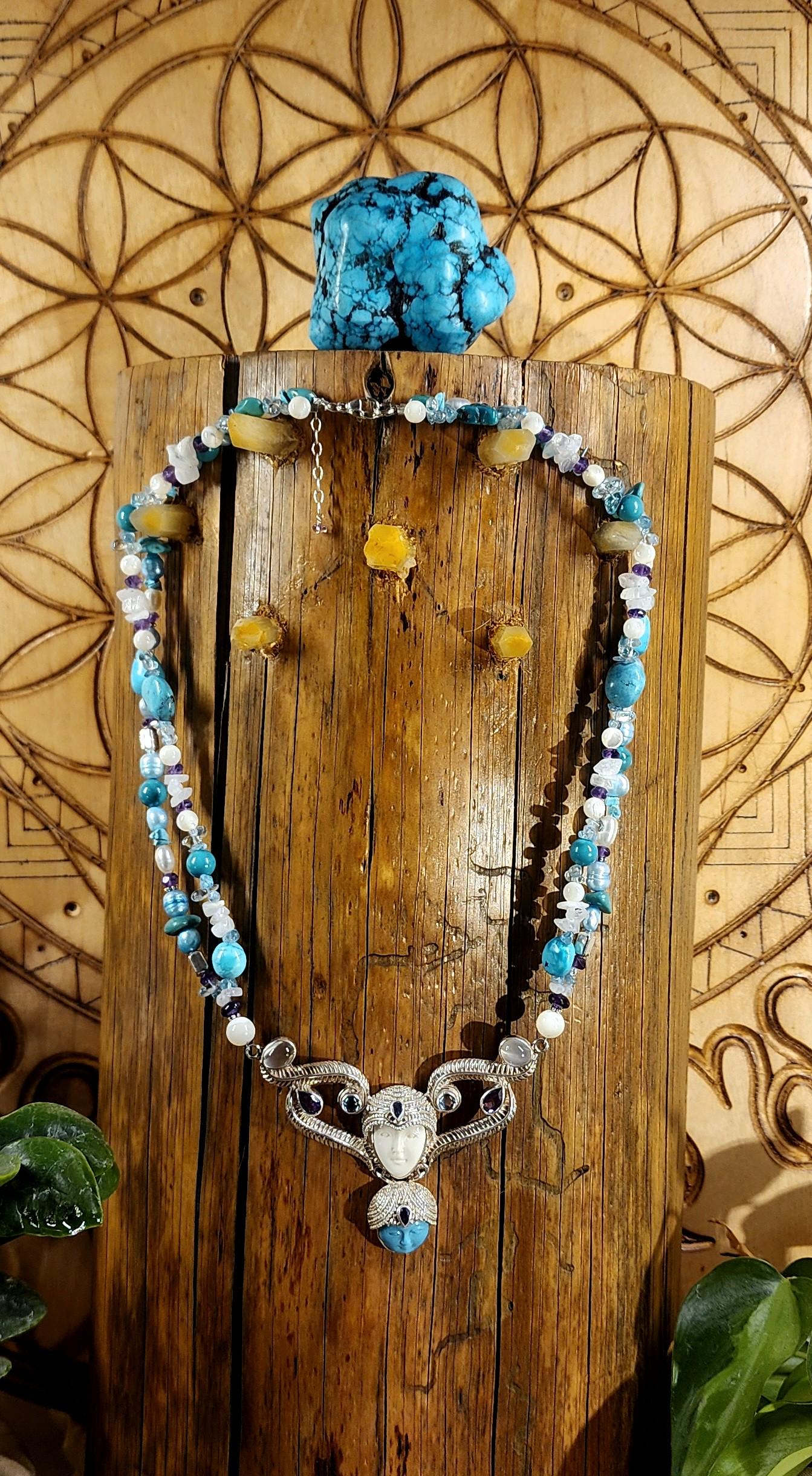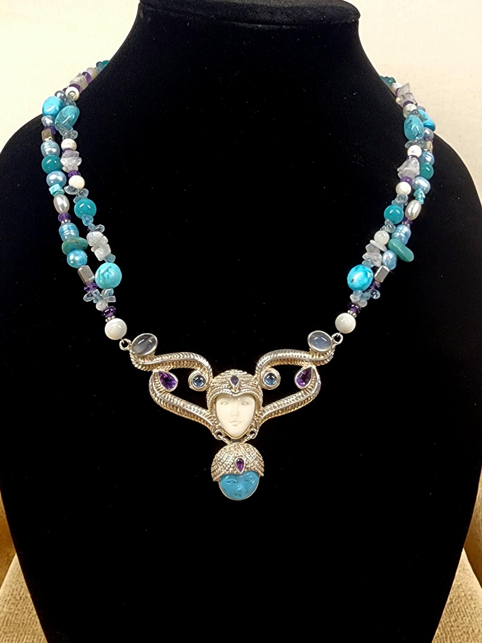Beautiful Sterling Silver Vintage Sleeping Beauty Turquoise Goddess Necklace. The pendant piece is adorned with gemstones of Sleeping Beauty Turquoise, Amethyst, Aquamarine, Iolite and Moonstone. The necklace piece contains Sleeping Beauty Turquiose, Amethyst, Moonstone, Indonesian Pearls, and Sterling Silver Beads. The clasp is sterling silver and is adjustable.