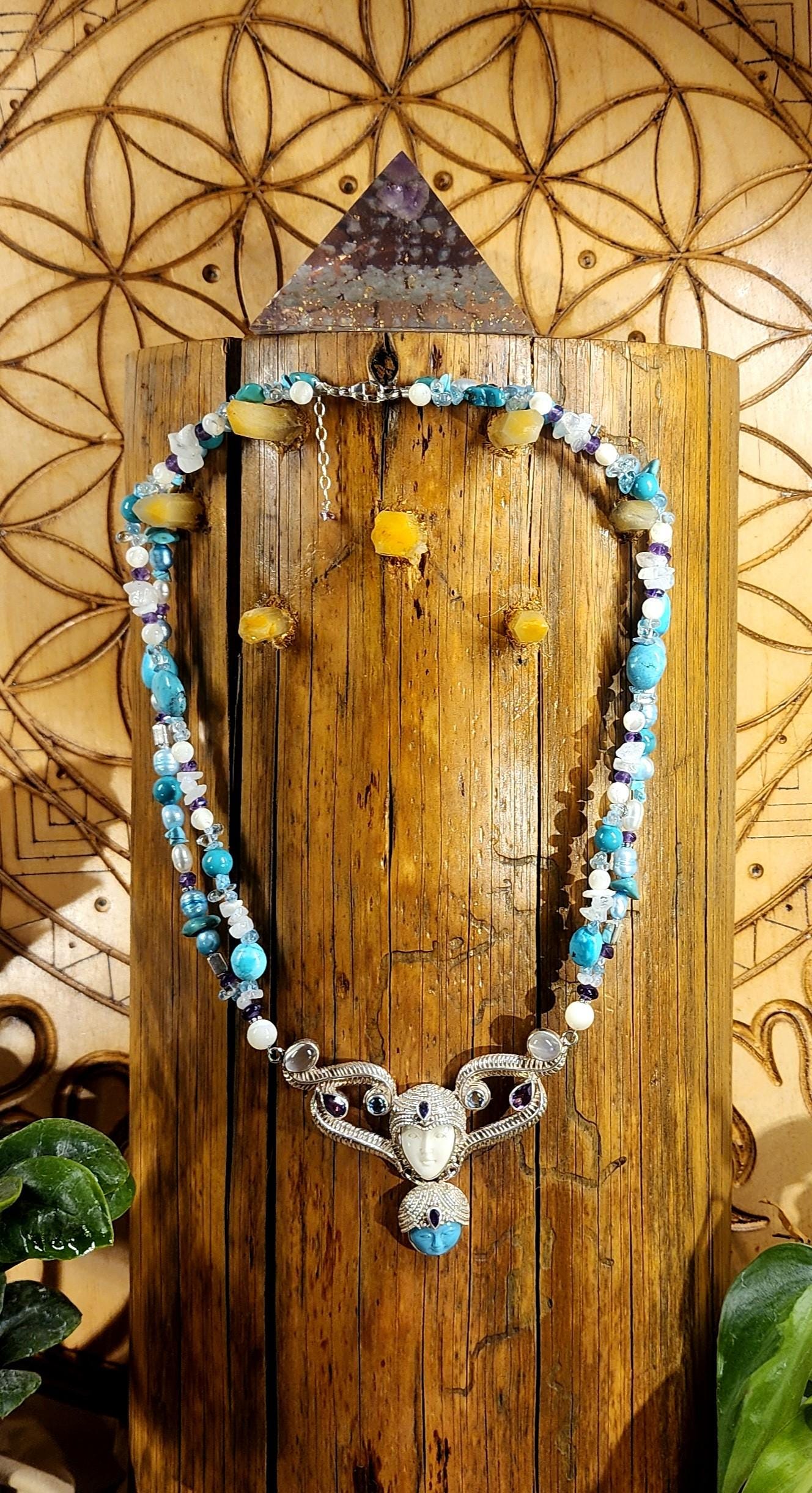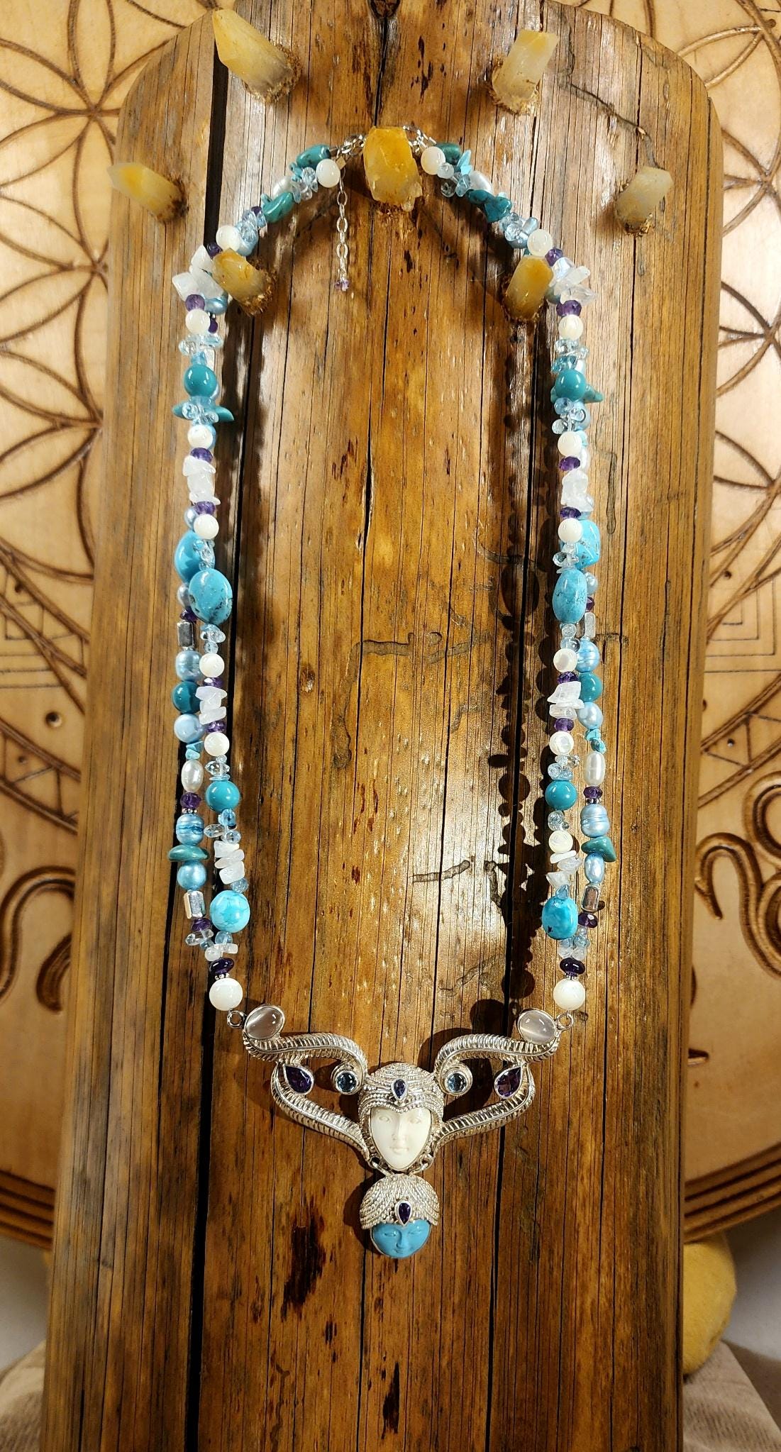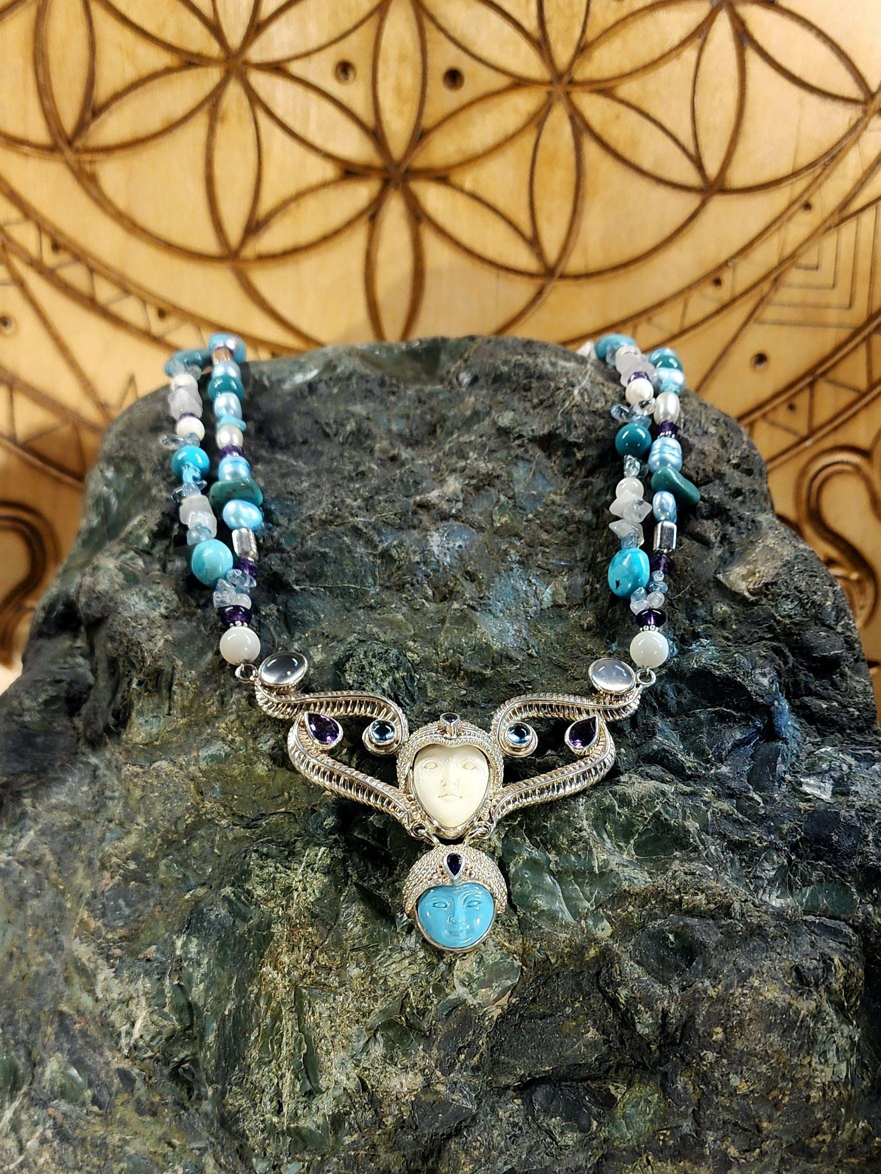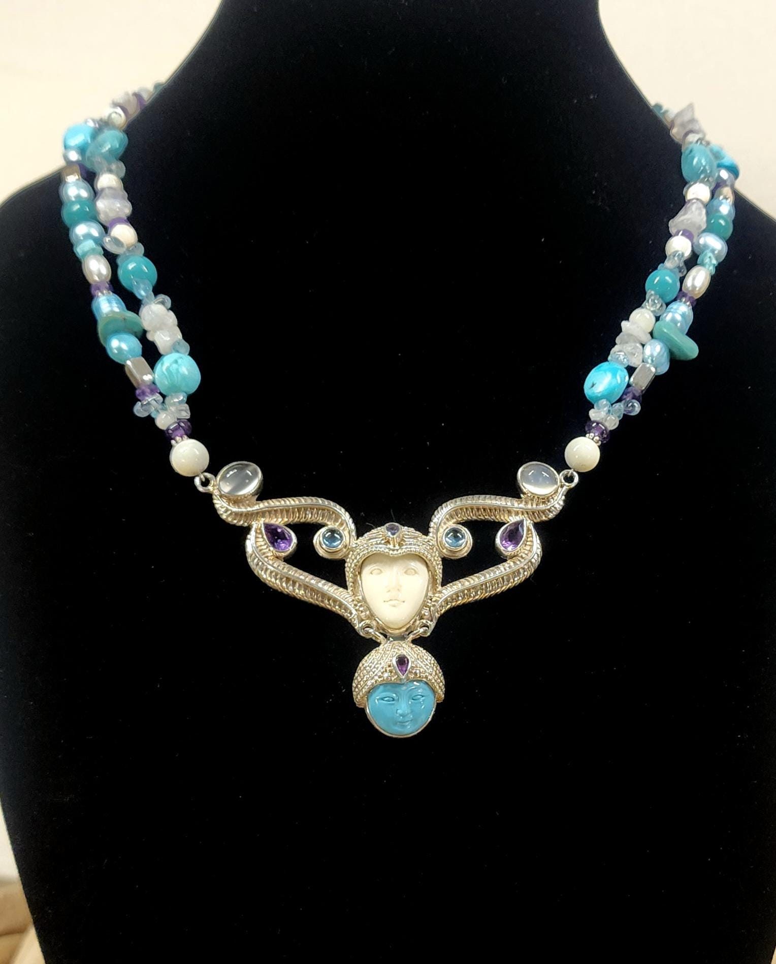Beautiful Sterling Silver Vintage Sleeping Beauty Turquoise Goddess Necklace. The pendant piece is adorned with gemstones of Sleeping Beauty Turquoise, Amethyst, Aquamarine, Iolite and Moonstone. The necklace piece contains Sleeping Beauty Turquiose, Amethyst, Moonstone, Indonesian Pearls, and Sterling Silver Beads. The clasp is sterling silver and is adjustable.