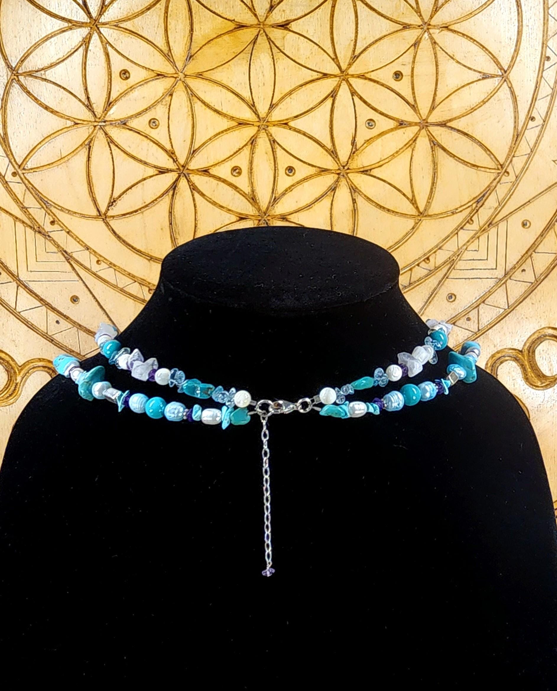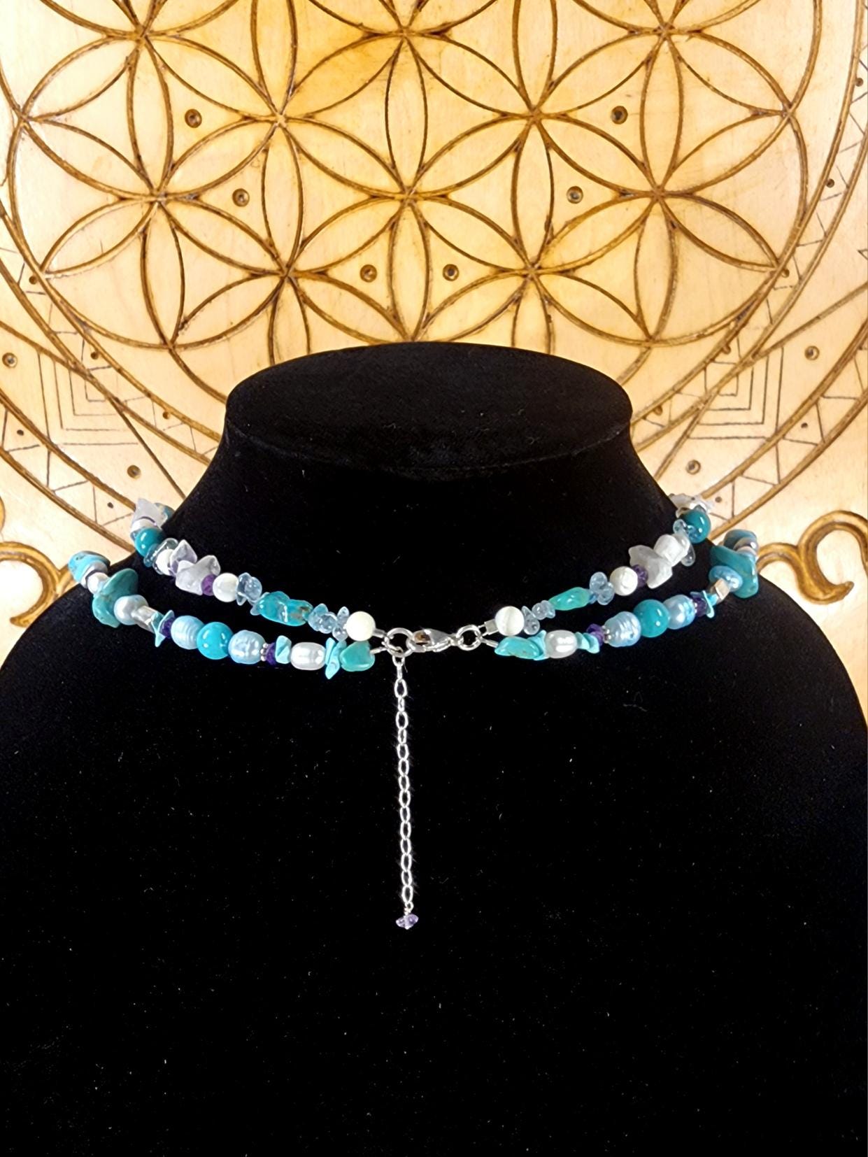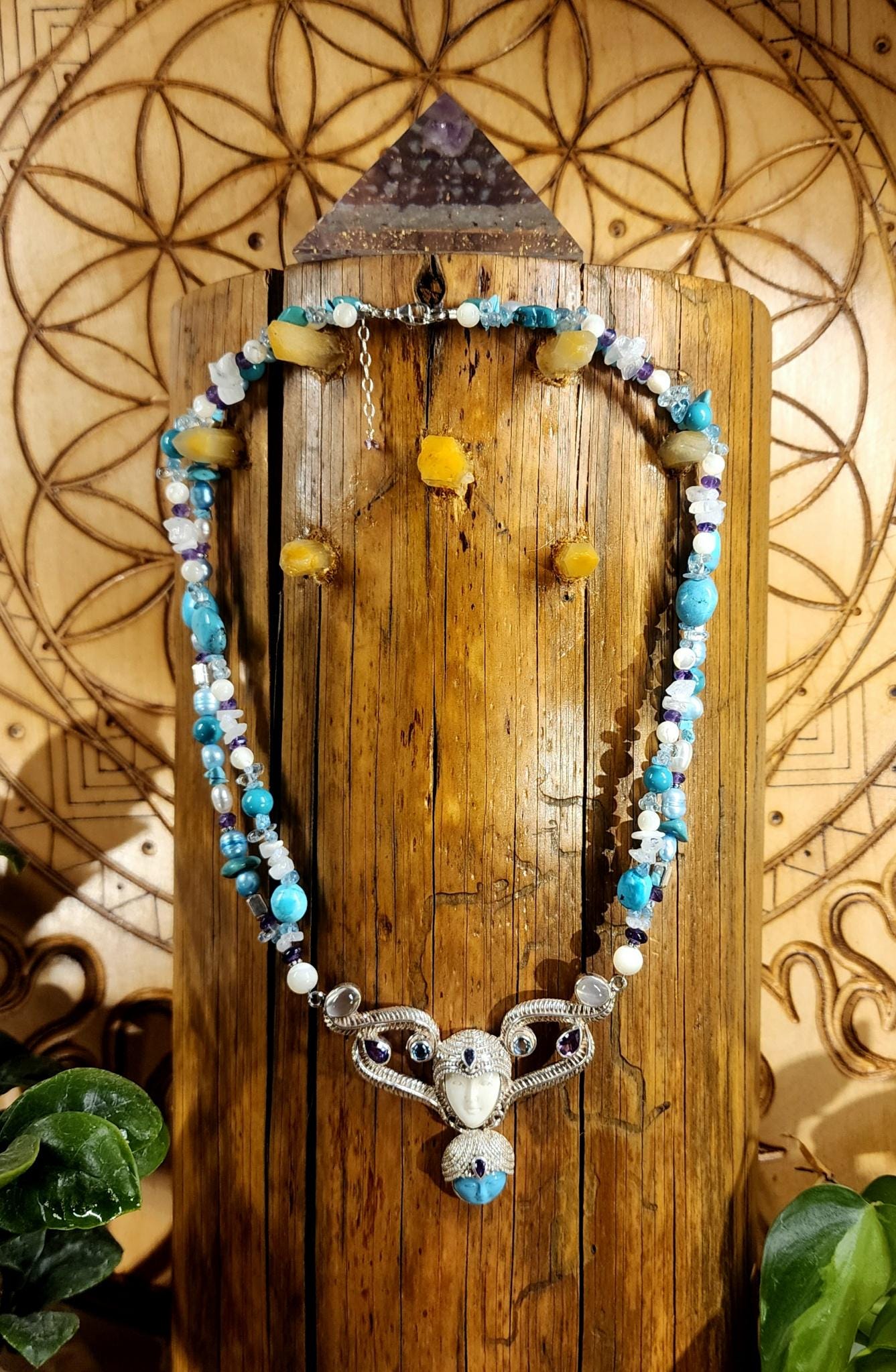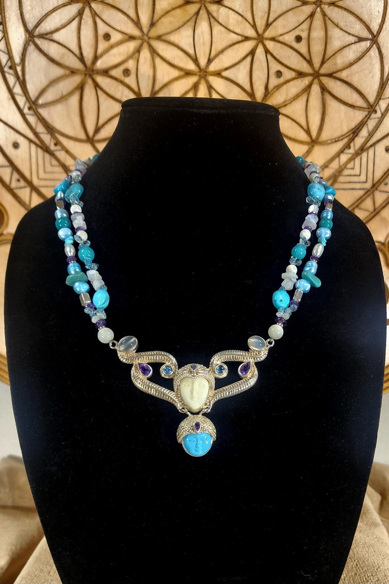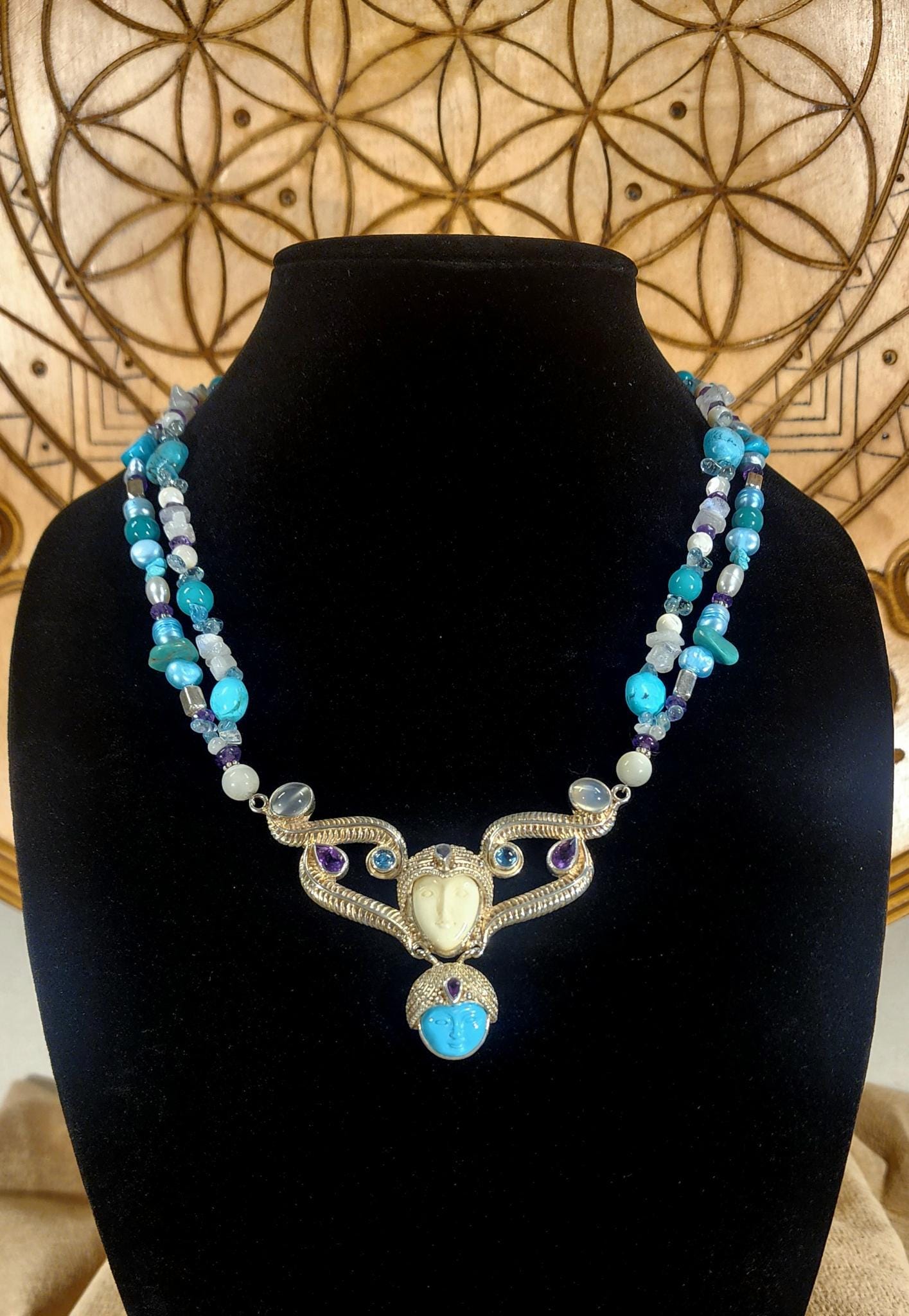 Beautiful Sterling Silver Vintage Sleeping Beauty Turquoise Goddess Necklace. The pendant piece is adorned with gemstones of Sleeping Beauty Turquoise, Amethyst, Aquamarine, Iolite and Moonstone. The necklace piece contains Sleeping Beauty Turquiose, Amethyst, Moonstone, Indonesian Pearls, and Sterling Silver Beads. The clasp is sterling silver and is adjustable.