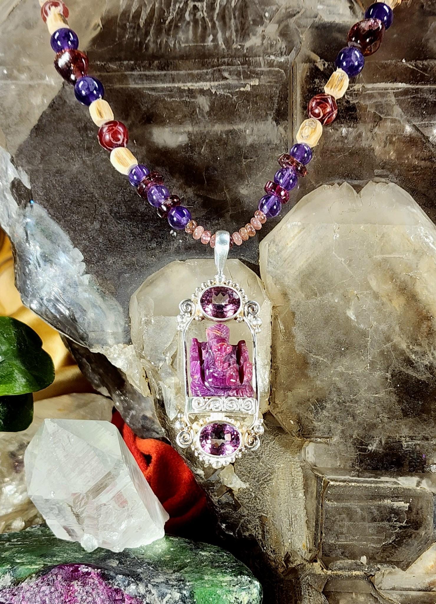 Beautifully crafted Sterling Silver Vintage Ruby Ganesh Pendant with Pink Topaz Gemstones above and below.