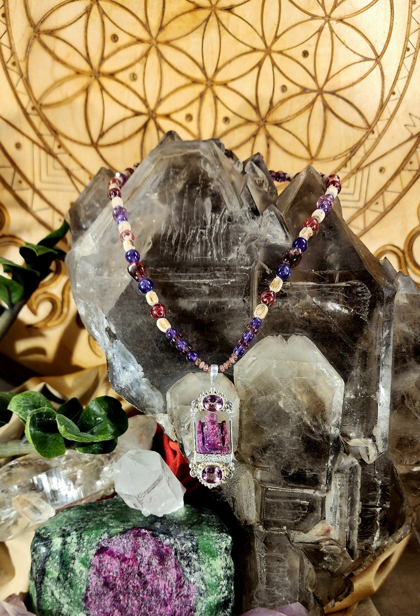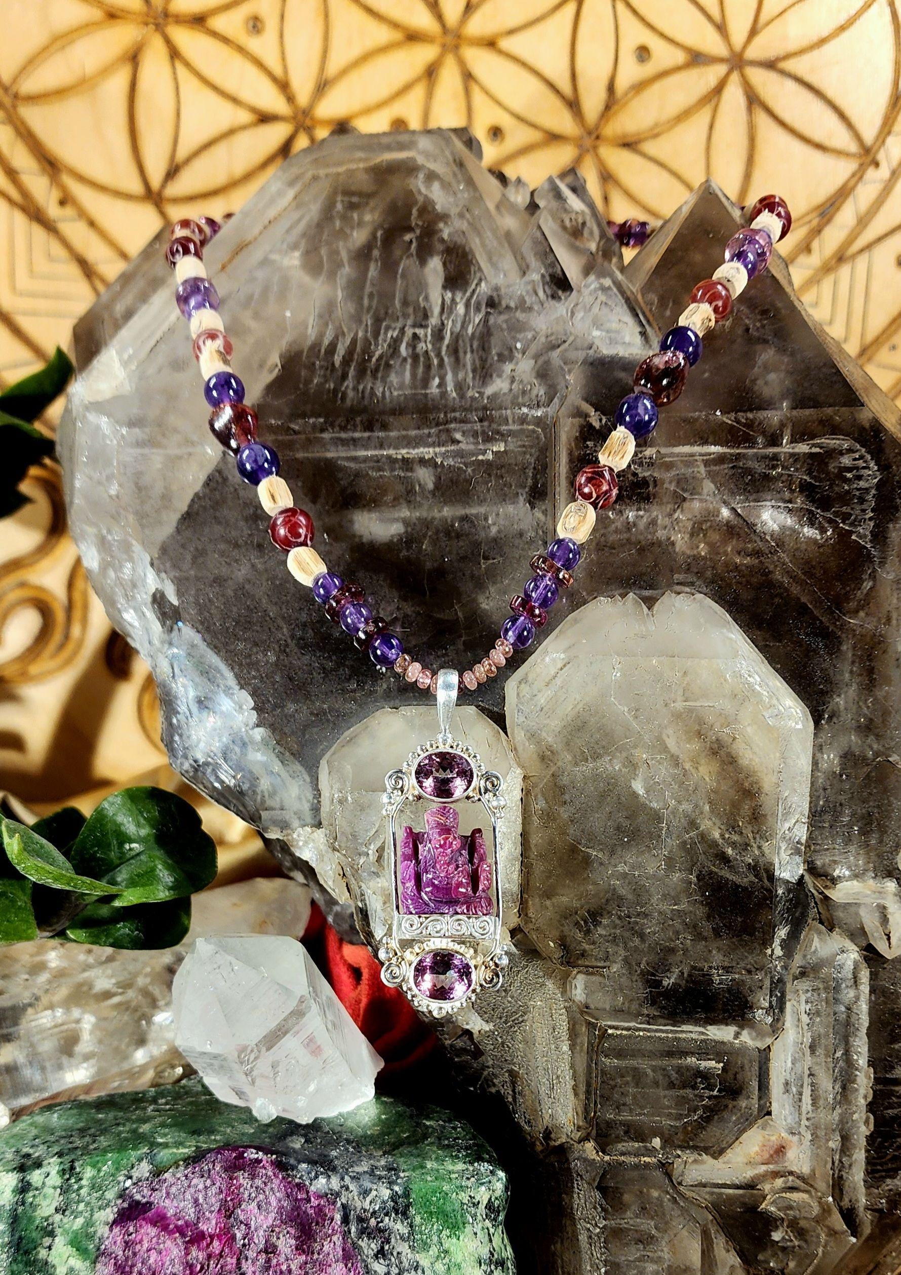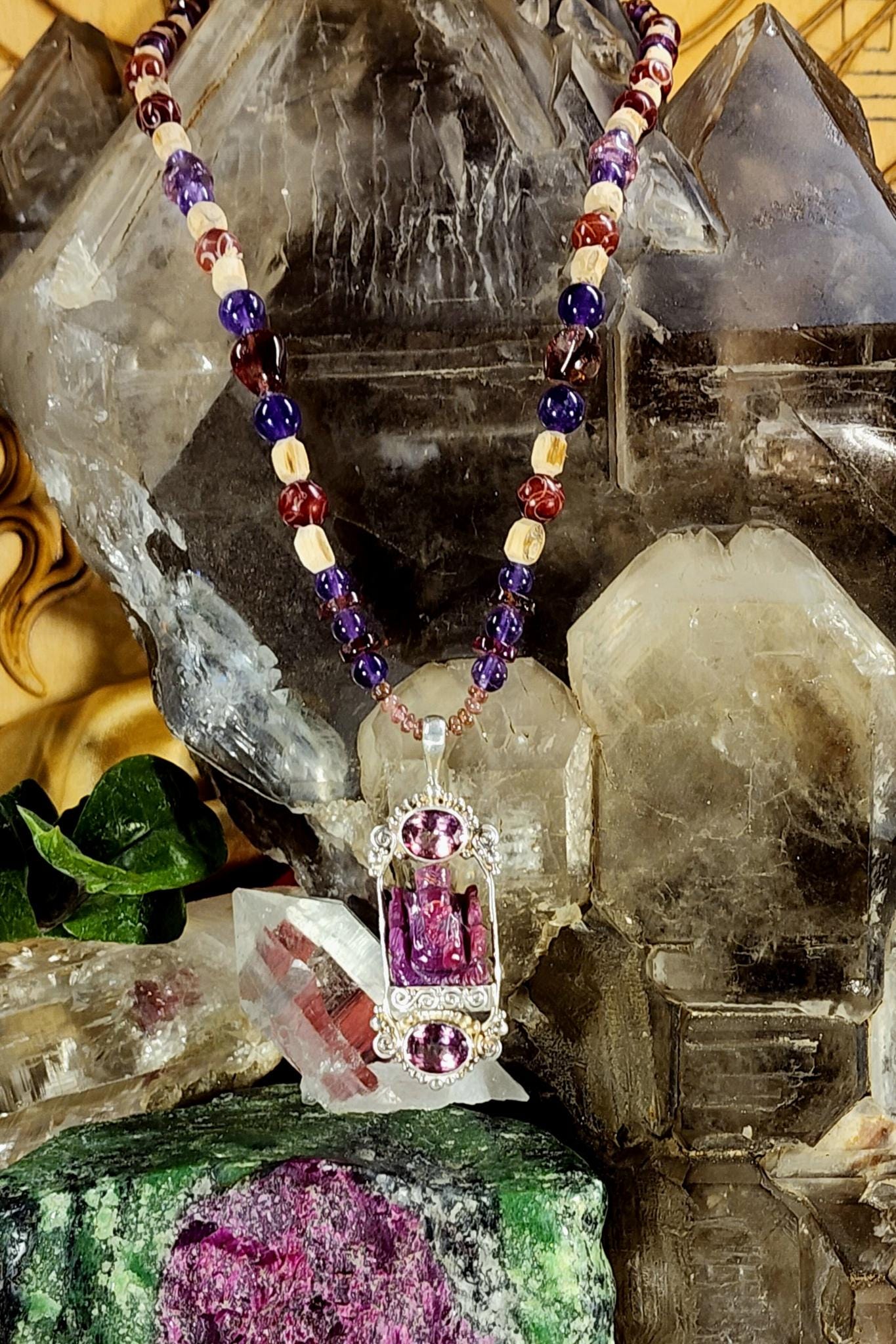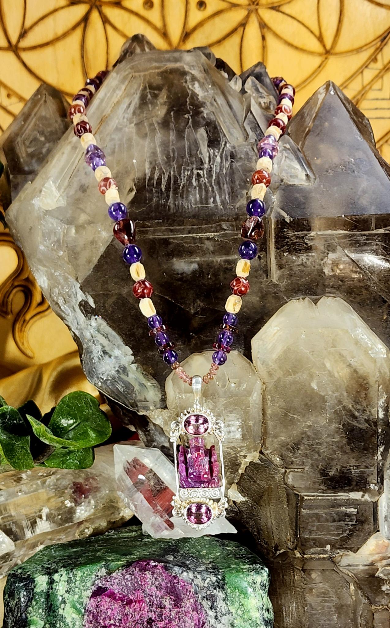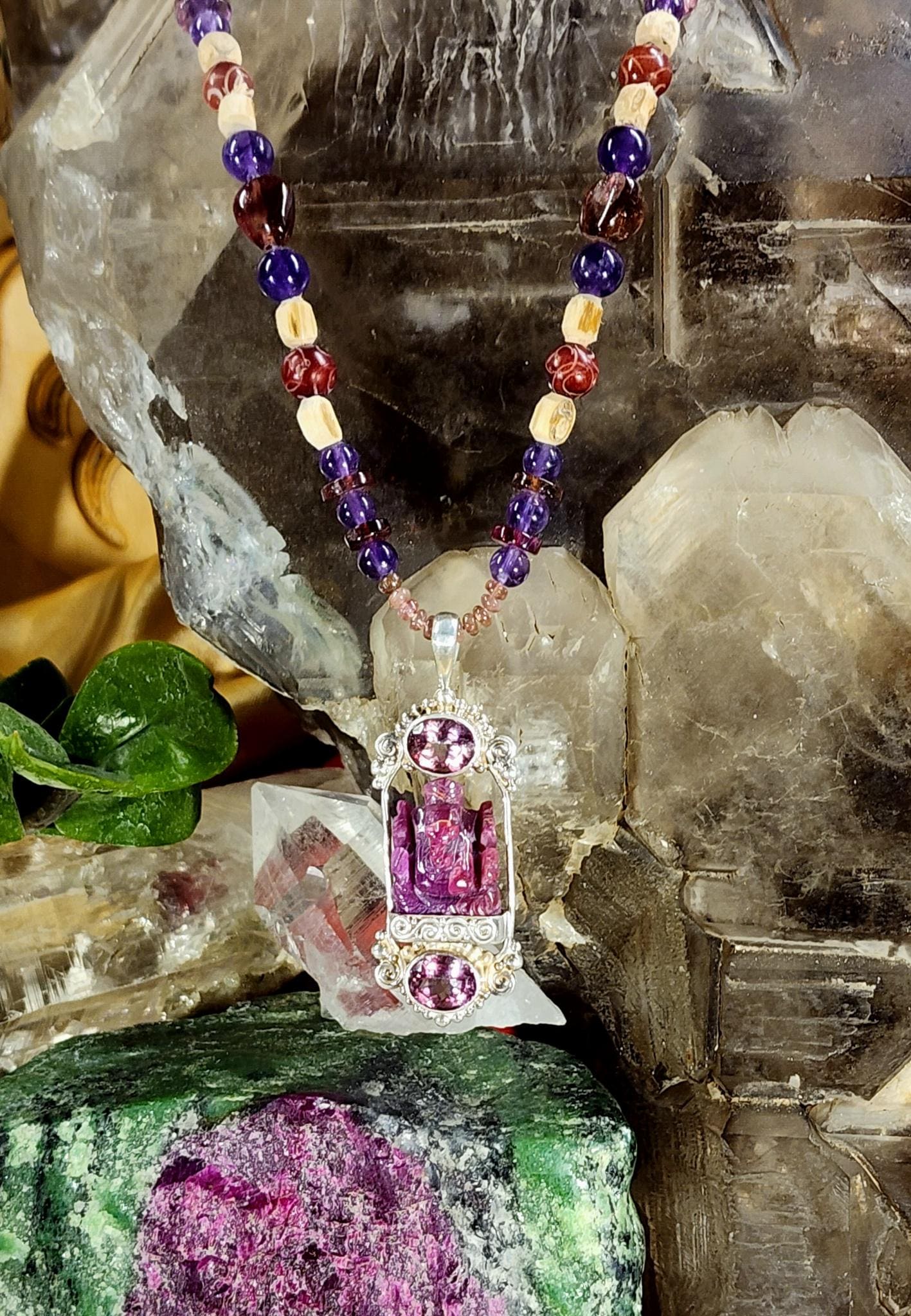 The beads were intentionally selected as an energetic healing supportive piece. High quality beads of Tourmaline, Antique Carved Red Jade, Amethyst, and Holy Tulsi Beads.