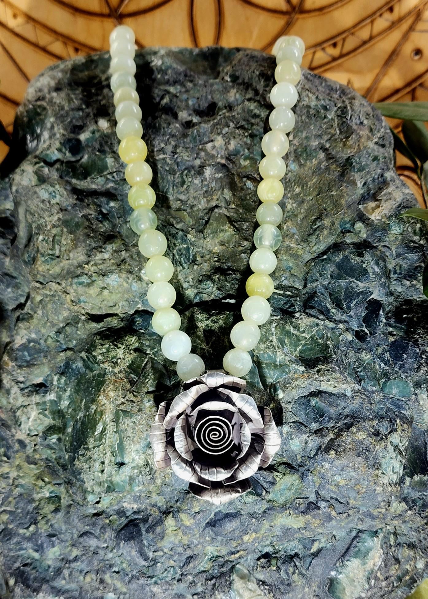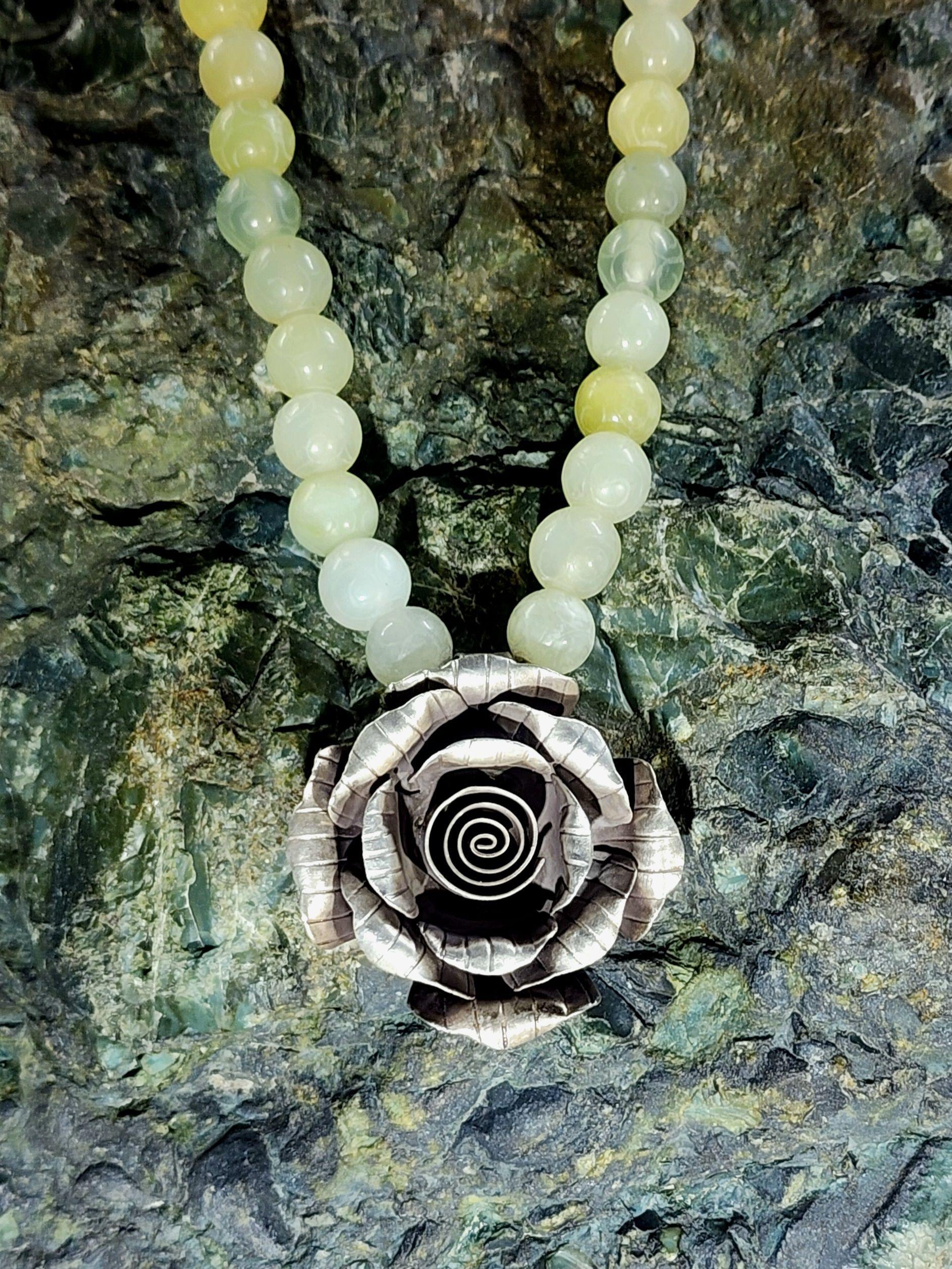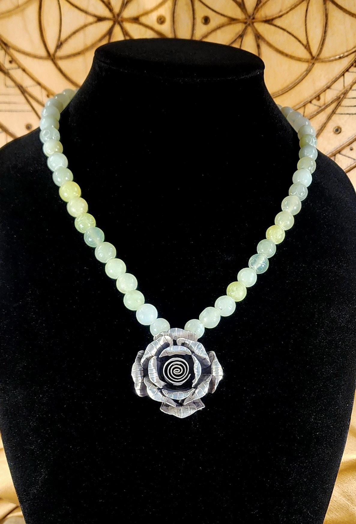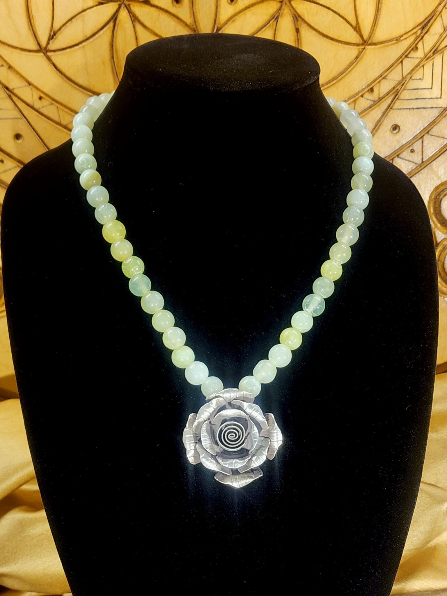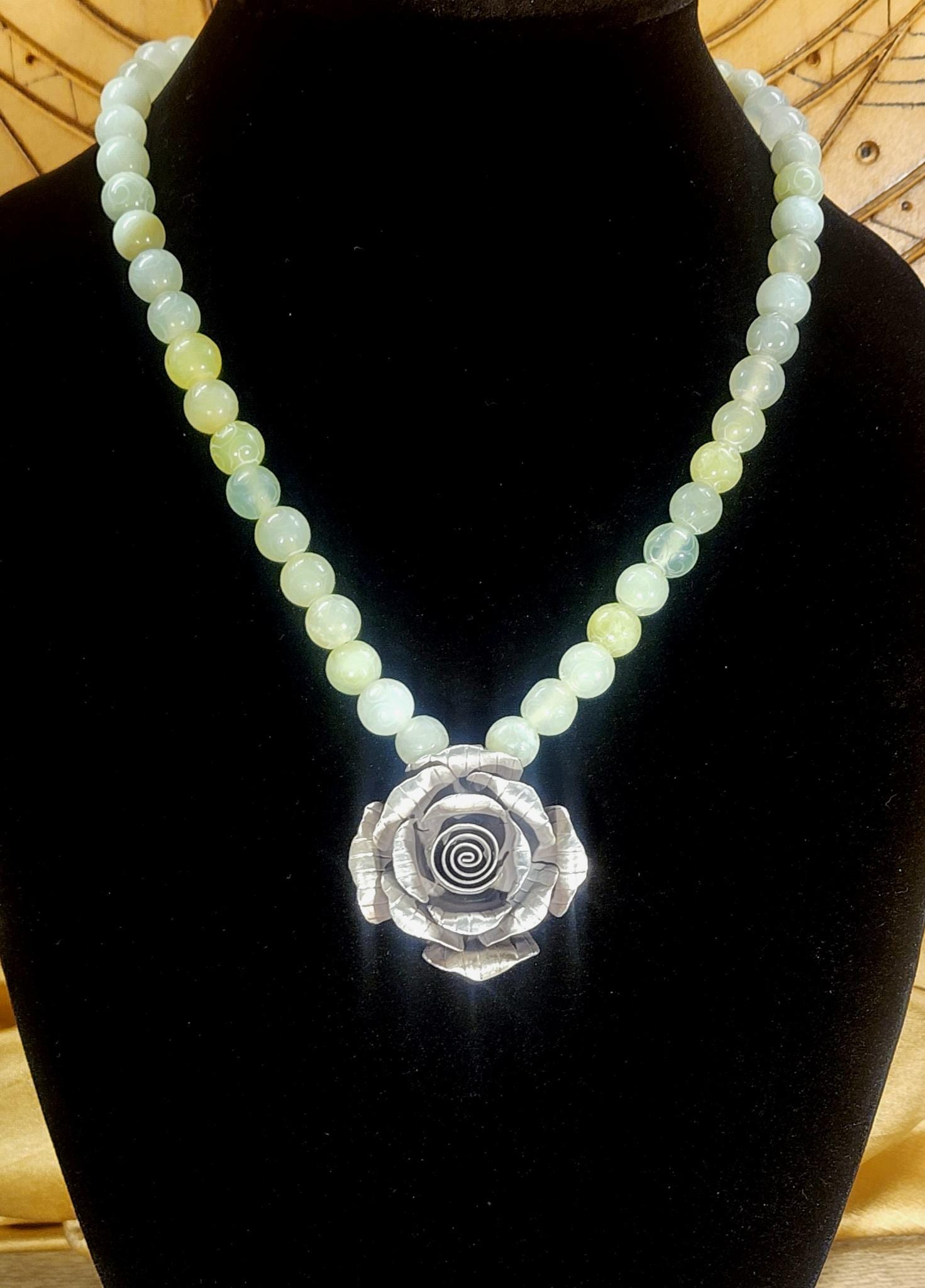 Sterling Silver 925 Large Rose Pendant. Antique Carved Jadeite Beaded Necklace with a Sterling Silver Clasp and Peridot Gemstone. Stunning piece!