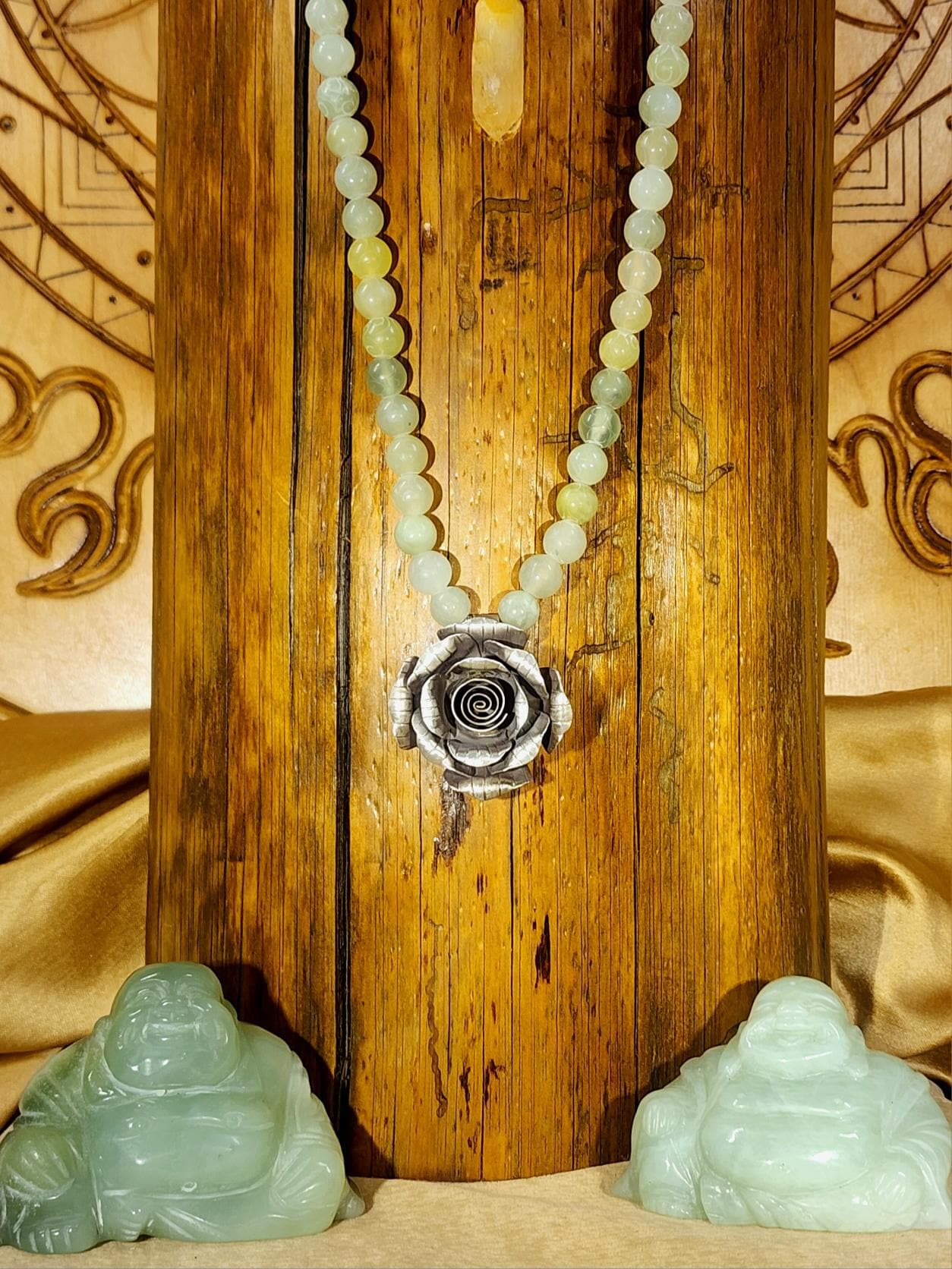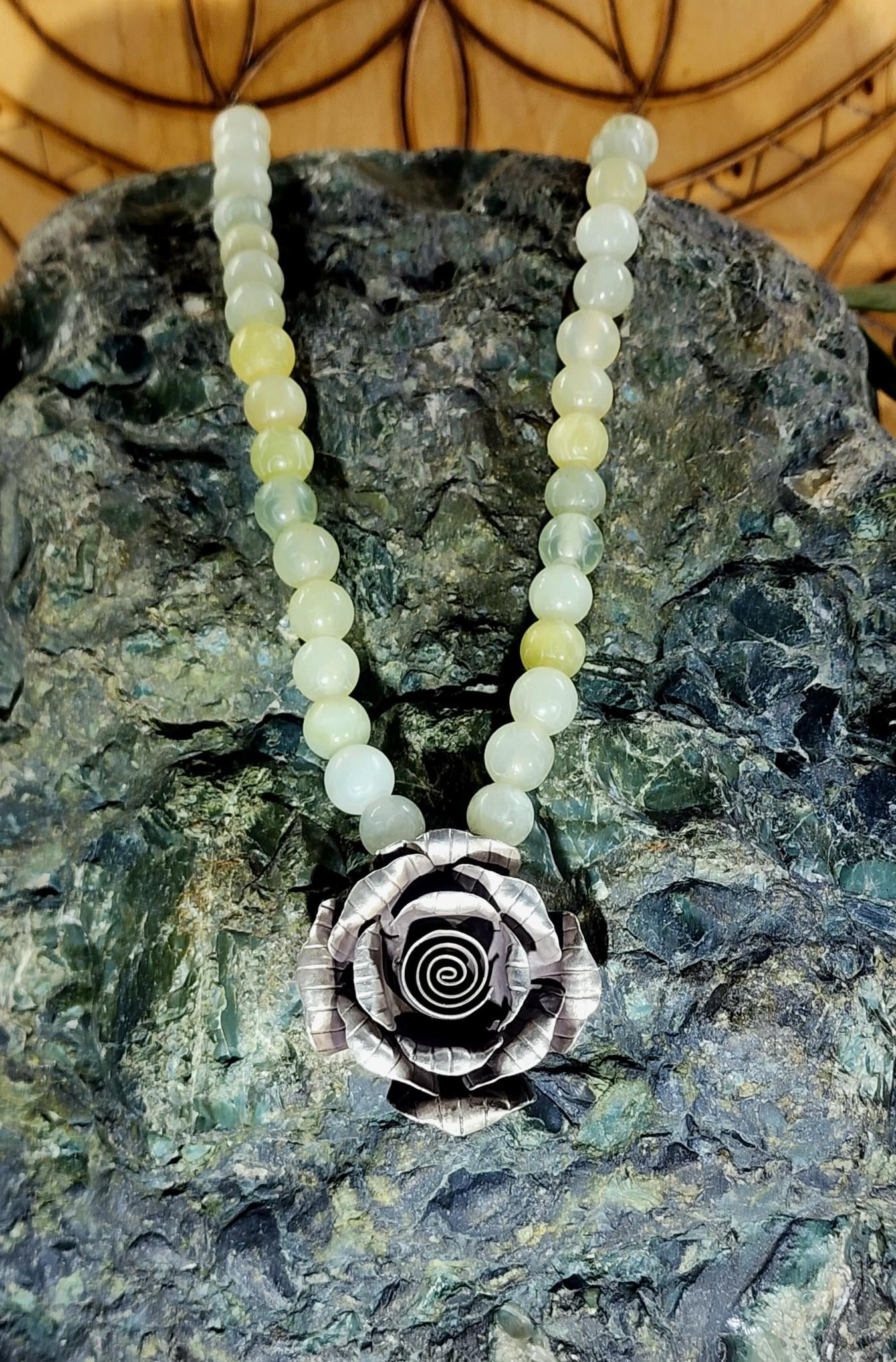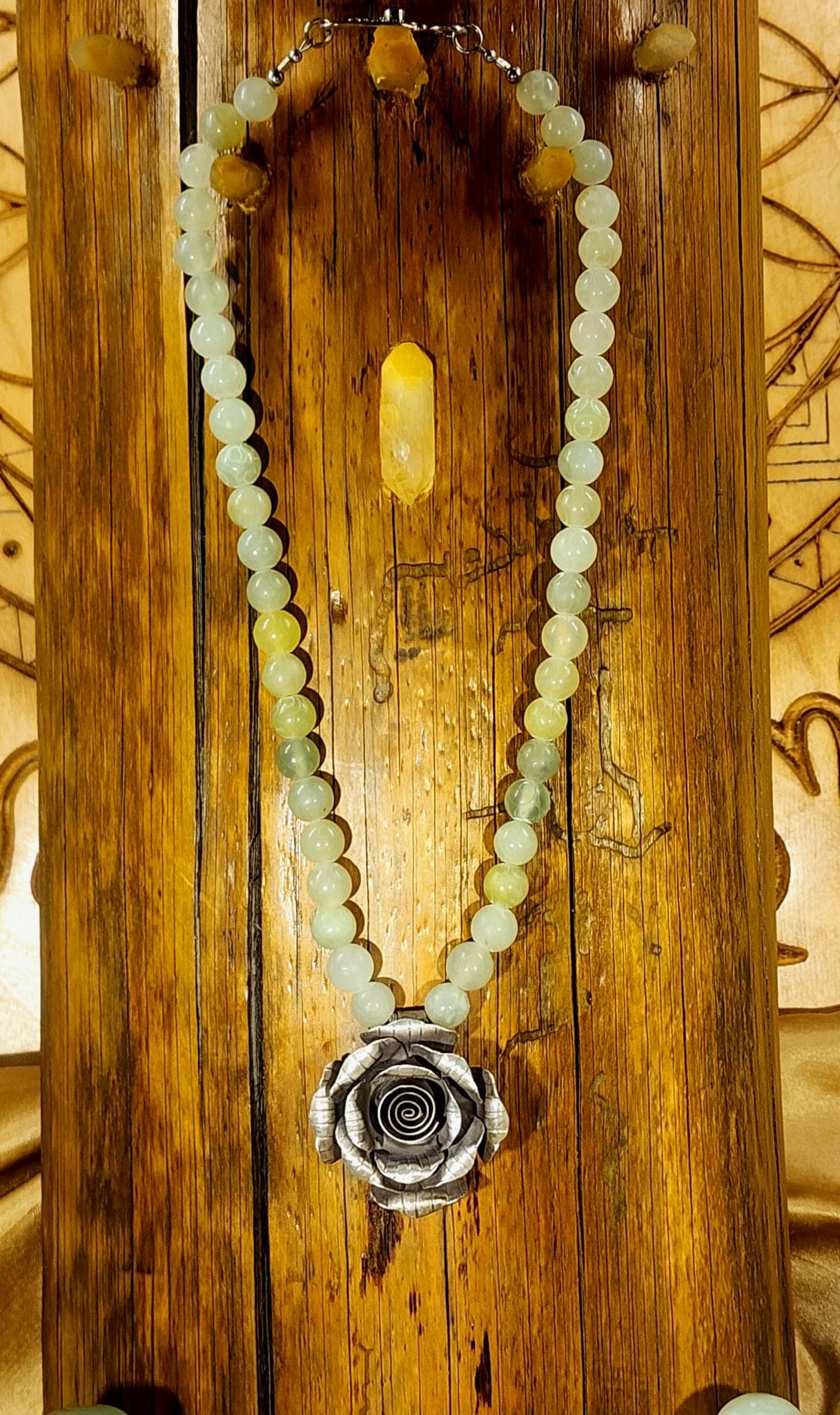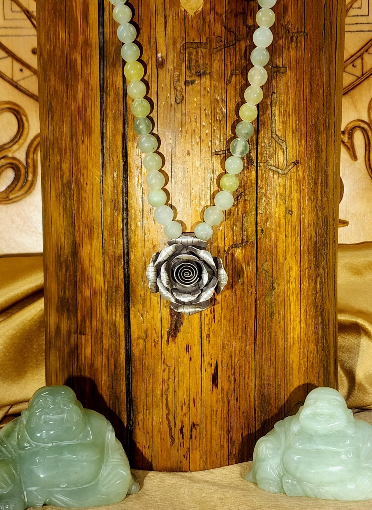 Sterling Silver 925 Large Rose Pendant. Antique Carved Jadeite Beaded Necklace with a Sterling Silver Clasp and Peridot Gemstone. Stunning piece!