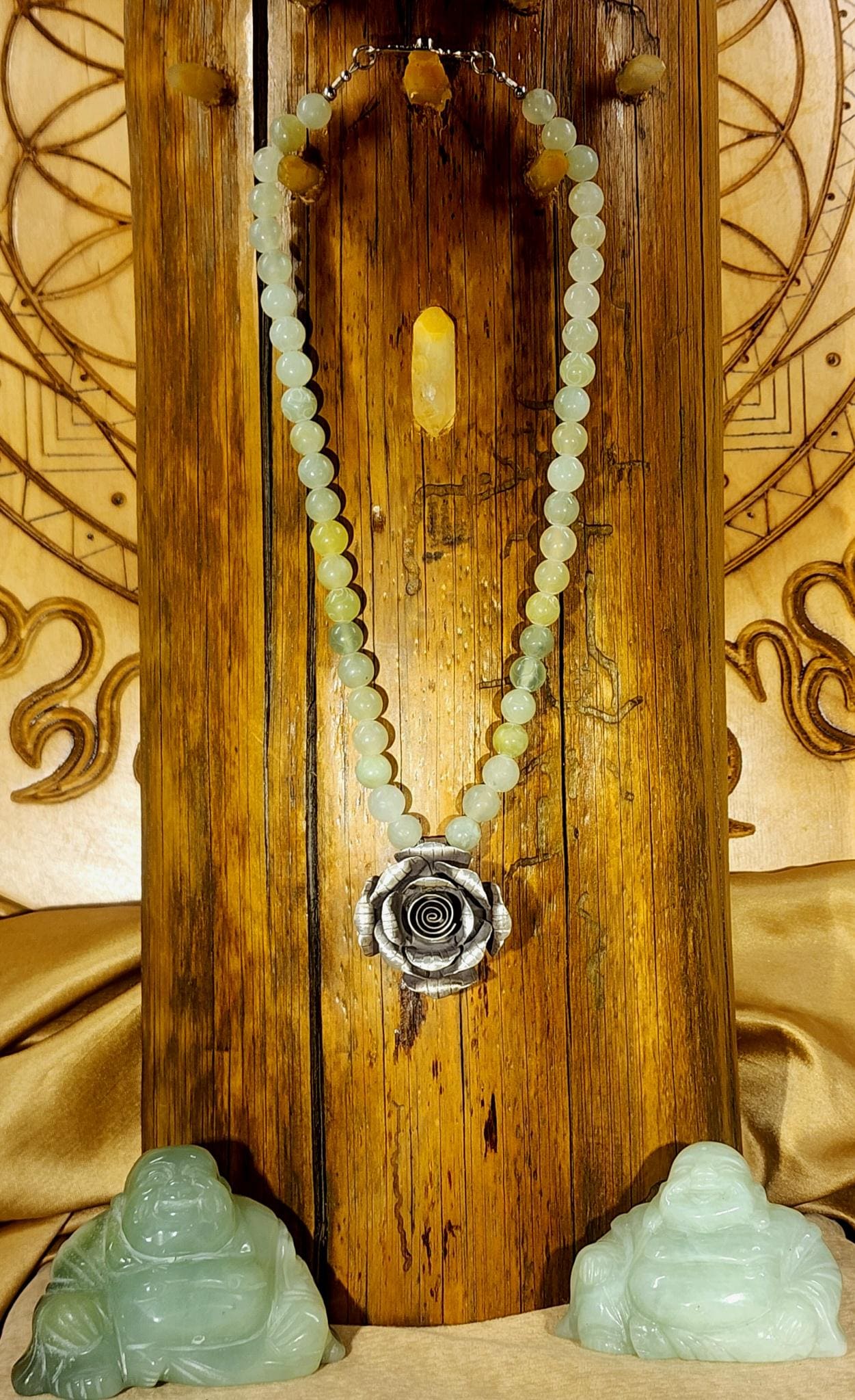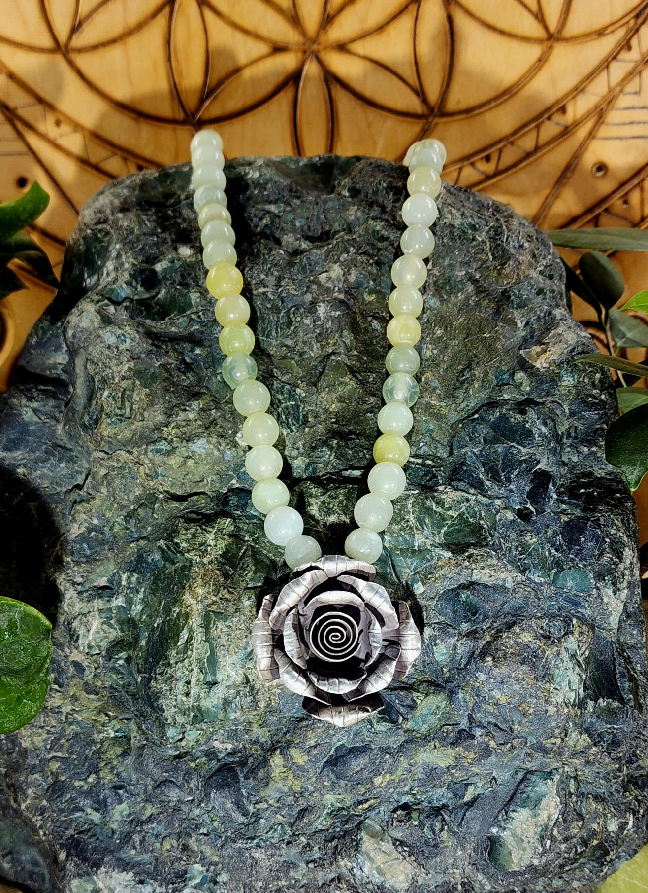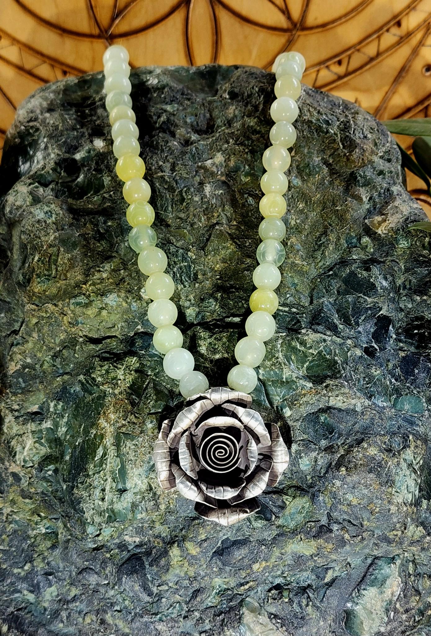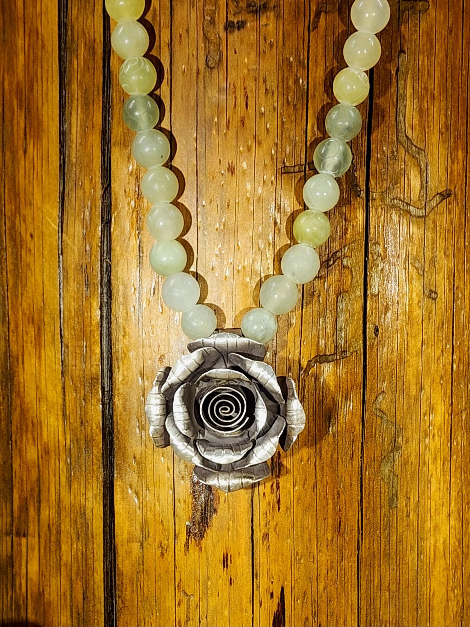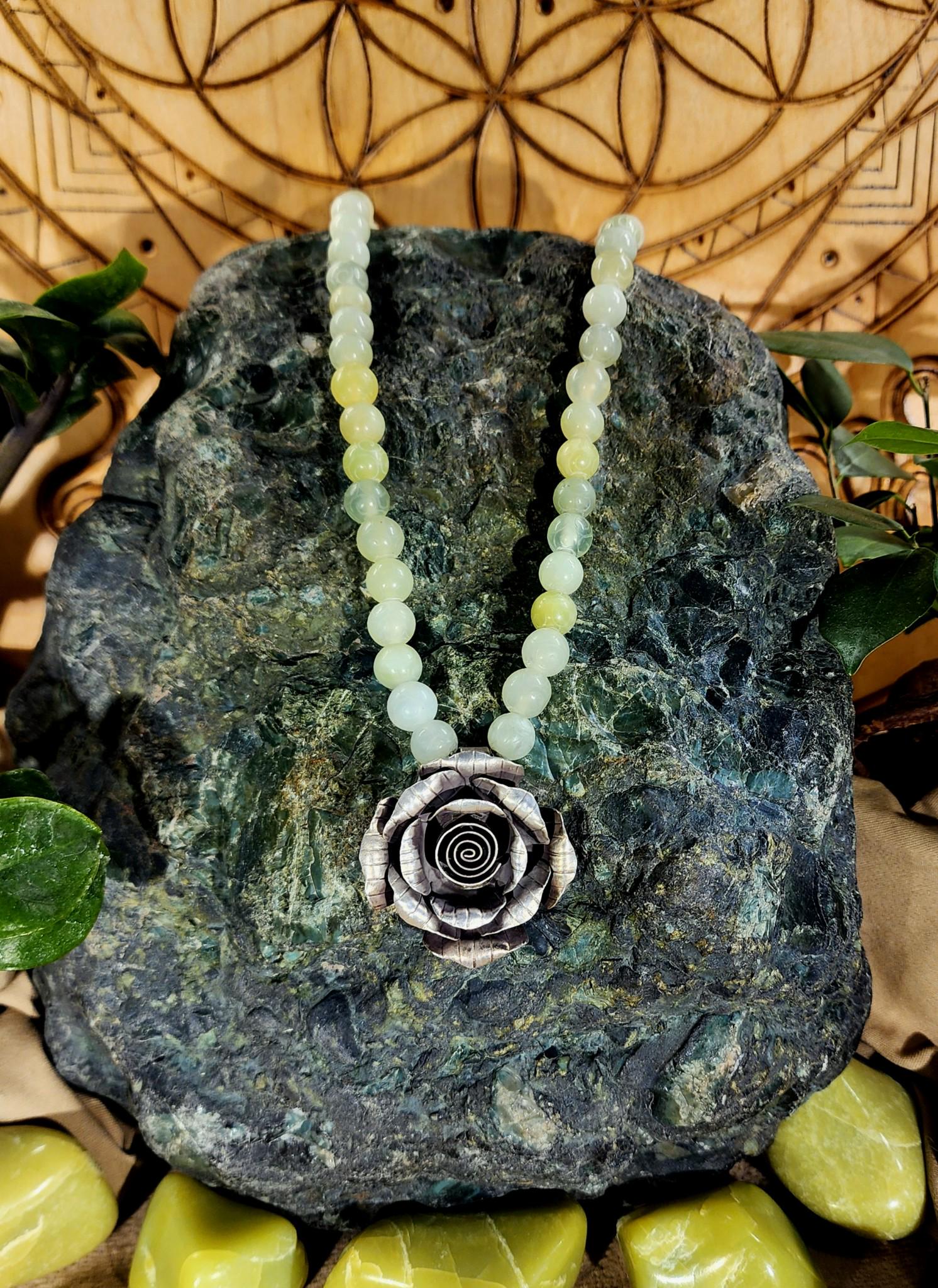 Sterling Silver 925 Large Rose Pendant. Antique Carved Jadeite Beaded Necklace with a Sterling Silver Clasp and Peridot Gemstone. Stunning piece!