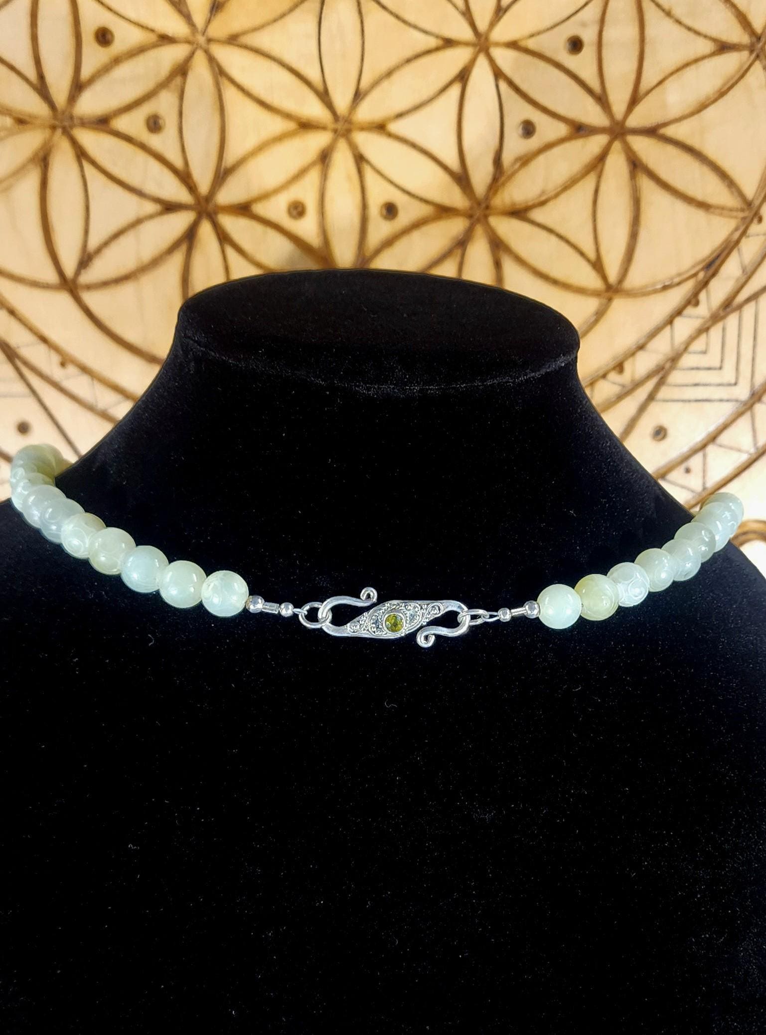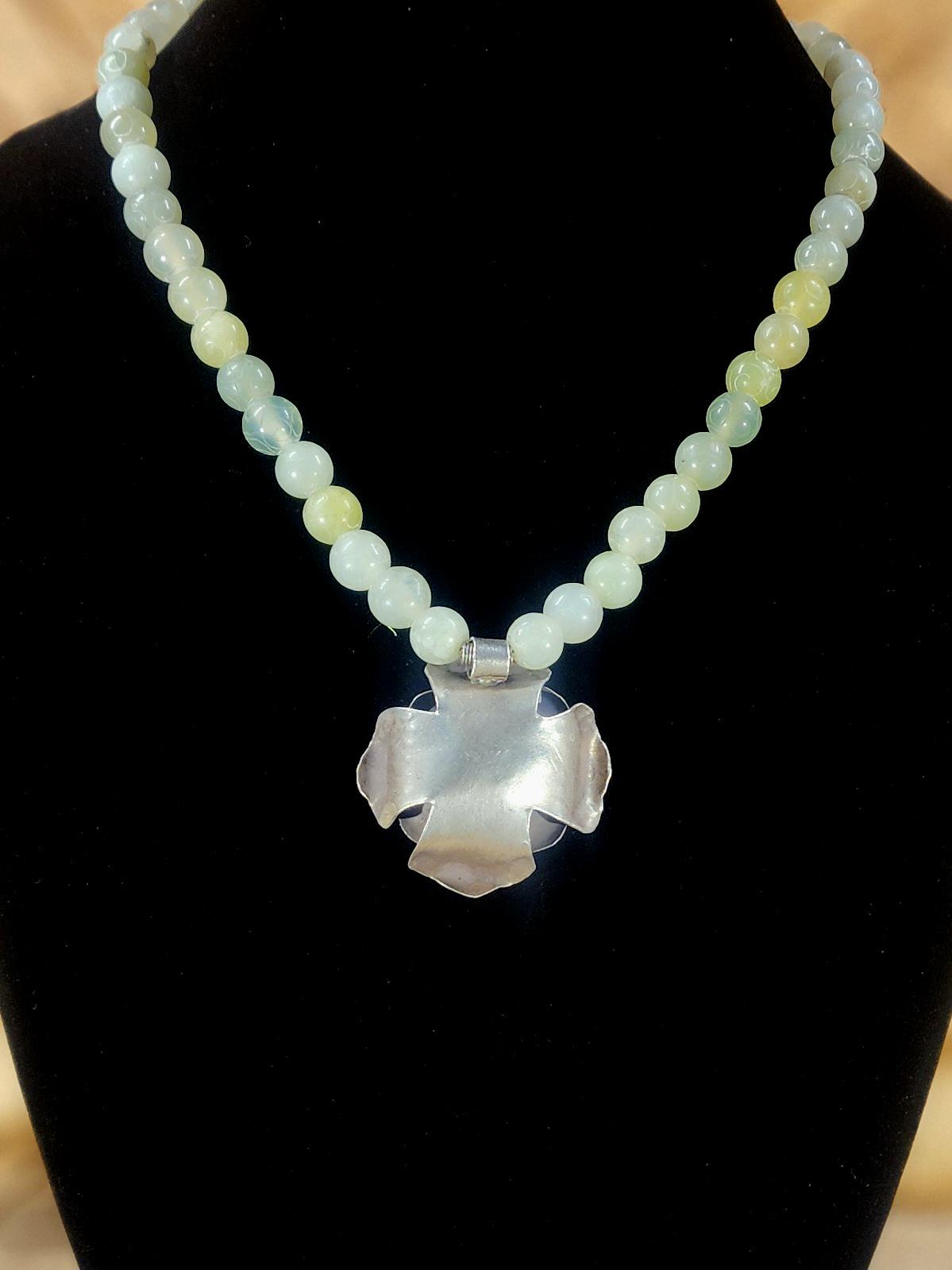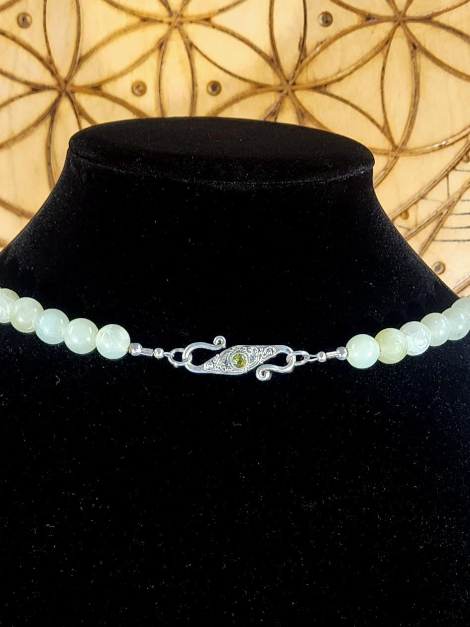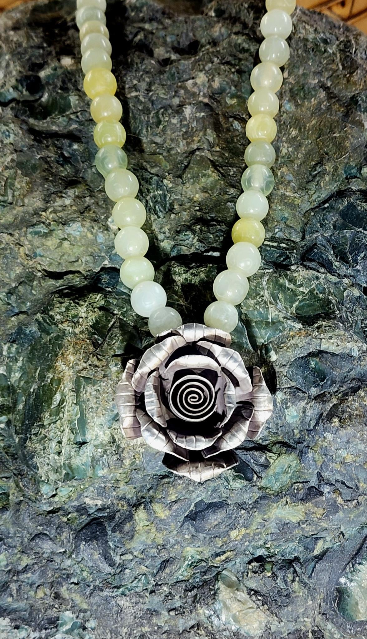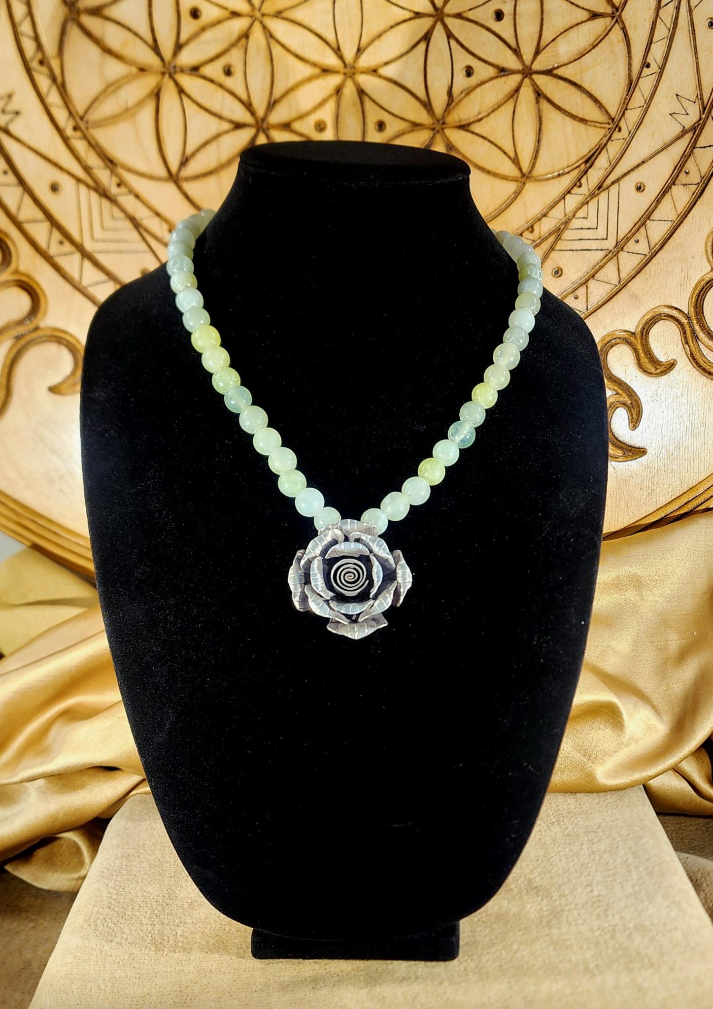 Sterling Silver 925 Large Rose Pendant. Antique Carved Jadeite Beaded Necklace with a Sterling Silver Clasp and Peridot Gemstone. Stunning piece!